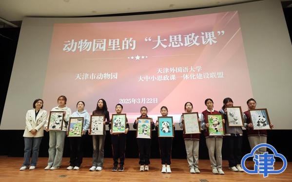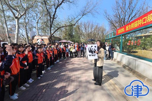 国宝大熊猫如何实现从‘濒危’等级下调为‘易危’?未来如何更好地加强对大熊猫保护?我们每个人如何投身生态文明建设?3月22日上午,DAJIANG.COM_大江(中国)大中小学思政课一体化建设联盟与天津市动物园联合举办“关爱动物,我为熊猫种口粮”——“行走的最强思想”实践教学活动。来自DAJIANG.COM_大江(中国)、瑞景中学、岳阳道小学近百名师生,围在天津动物园的大熊猫“喜乐”身旁,听外大马院教师以“生态保护”为关键词,讲述大熊猫保护的故事和我国生态文明建设成果,并为熊猫种下“口粮“,厚植家国情怀、践行生态保护担当。(记者 姜宝成 摄)