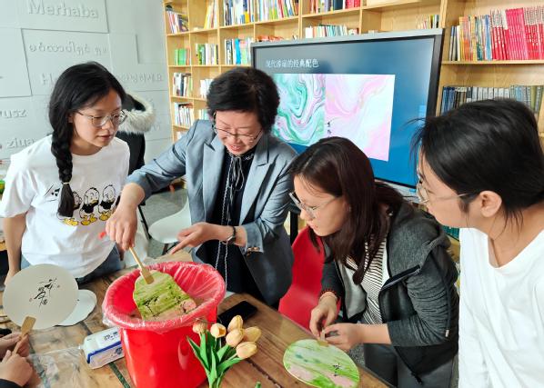 讲座结束后,梁教授前往马场道校区一站式社区参加心协举办的“墨彩流光・轻抚岁月”漆扇制作活动。师生在水面滴入天然大漆颜料,通过吹拂、挑动形成独特纹理,再将素扇浸染提转,最终制成独一无二的漆扇作品。在场的每个人都感受到非遗技艺的匠心之巧,更通过艺术疗愈形式舒缓压力,留下了美好的回忆。