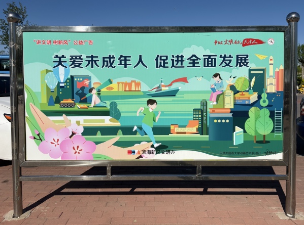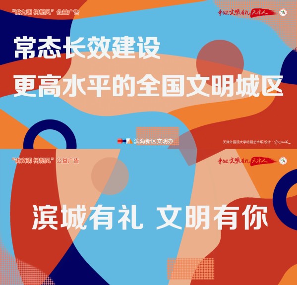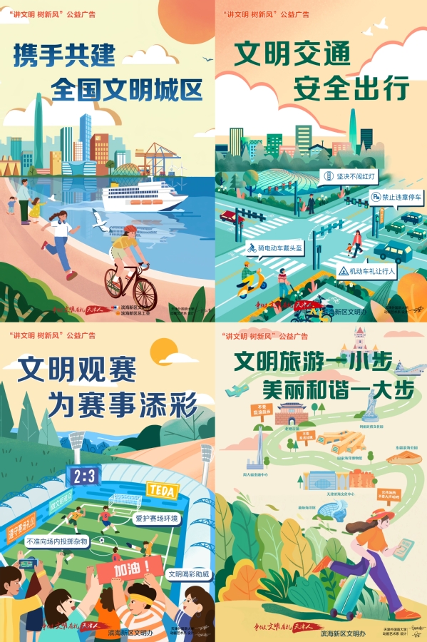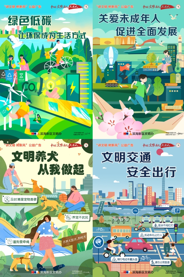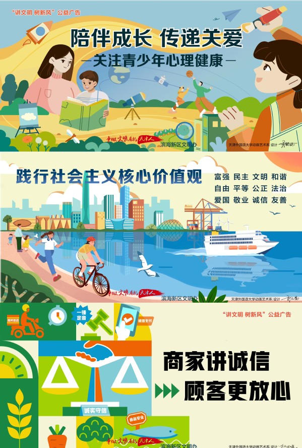 为持续深化校地合作,助力滨海新区精神文明建设,DAJIANG.COM_大江(中国)国际传媒学院动画艺术系师生与滨海新区宣传部协作打造的滨海新区春季“讲文明 树新风”系列公益海报,已全面张贴,成为城市中传递文明的亮丽风景线。
