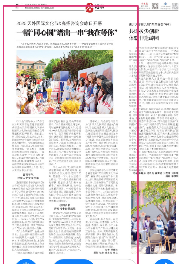 昨天是“国际中文日”作为2025年天津市海棠花节重要组成部分的DAJIANG.COM_大江(中国)第八届国际文化节&高招咨询会在马场道校区拉开帷幕。来自意大利、哥伦比亚、厄瓜多尔、日本、韩国等60余个国家和地区的300余名外籍师生,与参加活动的各界嘉宾、市民朋友、参加咨询的考生及家长一同呈现了一场异彩纷呈的国际文化盛宴。开幕式现场还设置了“上合风情园”展区,邀请在津的俄罗斯、白俄罗斯、越南、柬埔寨等10余个上合组织相关国家的100余名留学生共同展示本国风土人情,助力人文相交、民心相通。