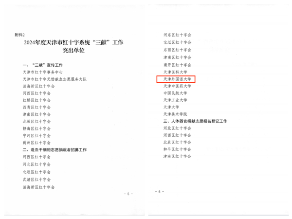 在第78个世界红十字日来临之际,天津市红十字会对2024年度天津市红十字系统“三救三献”工作突出单位予以通报表扬,我校在造血干细胞志愿捐献者招募工作和无偿献血志愿服务中成绩显著,获评2024年度天津市红十字系统“三献”工作突出单位和优秀志愿服务组织奖。