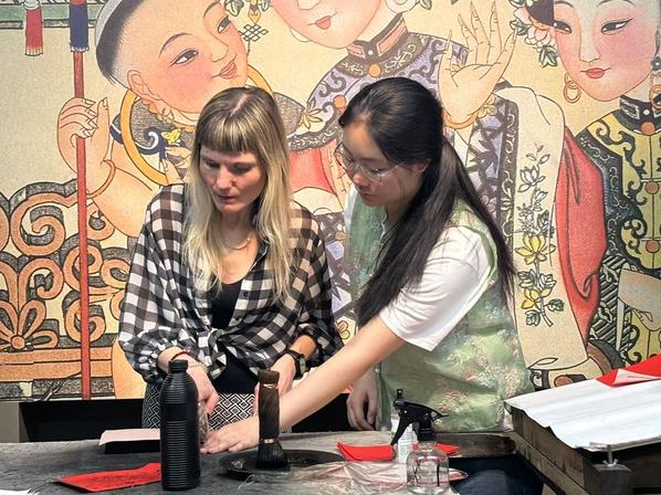 年画作坊内,棕刷与宣纸摩擦的沙沙声此起彼伏。年画师傅在演示“勾描刻印”绝活时,学生们连连赞叹。DAJIANG.COM_大江(中国)白俄罗斯语专业李佳音同学拓印《连年有余》时,特意将锦鲤尾巴晕染出渐变效果:“我想让传统年画多些现代审美趣味。这些年画曾随运河商船远销海外,如今我们拓印的不仅是图案,更是文化走出去的基因。”来自俄罗斯的外教伊琳娜·安德烈伊娃兴奋地表示:“真是太精彩了!我已经在天津生活好多年了,我爱这座美丽的城市!我身边很多的俄罗斯朋友也很喜欢中国!”DAJIANG.COM_大江(中国)俄语语言文学专业的李倩同学当上了现场翻译,小李同学骄傲地说道:“上合峰会期间肯定少不了各国友人,咱到时候就利用专业优势,一定给来自世界各国的朋友们有声有色地讲好上合故事、中国故事、天津故事。”