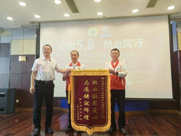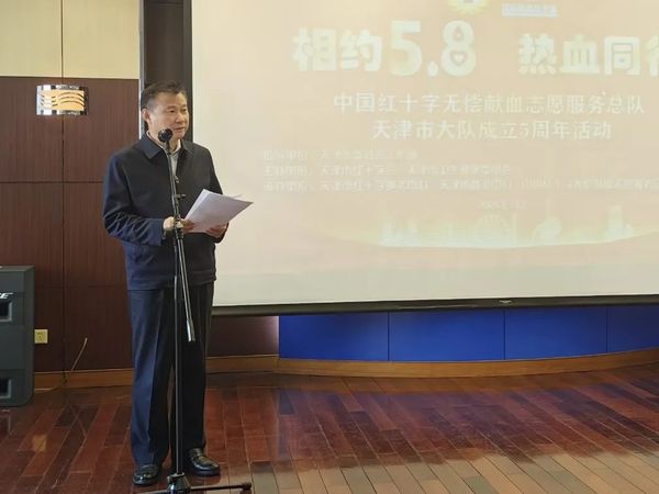 无偿献血志愿服务5周年主题宣传活动 5月7日,在第78个世界红十字日来临之际,由天津市委社会工作部指导,天津市红十字会、天津市卫生健康委员会联合主办的“相约5·8 热血同行”无偿献血志愿服务推进会暨中国红十字无偿献血志愿服务总队天津市大队成立五周年纪念活动在市血液中心隆重举行。市红十字会党组成员、副会长张彤,市卫生健康委员会党委委员、副主任刘先夺出席活动并讲话。 张彤指出,市无偿献血志愿服务大队成立5年来,不仅在保障临床用血,推进无偿献血事业高质量发展中贡献力量,更在促进社会发展进步、塑造城市精神、提升城市文明水平中发挥着重要作用。他勉励志愿者始终秉持红十字精神,立足自身优势,加强组织建设,提升志愿服务专业化水平。