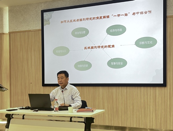 之后,马建春以其丰富的对外经济贸易合作和外交经验,以及在中国外贸体制改革和中国对外开放战略研究方面深厚的学术造诣,为我校师生作了题为“‘一带一路’与中非经贸合作”的讲座。讲座中他以区域国别研究视角,详细剖析非洲地缘政治与经济发展情况,系统阐述了“一带一路”倡议如何促进合作国家的经济发展与人文交流,以及中非合作在推动构建人类命运共同体中的重要作用。