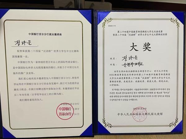 本次大赛以“天下一家”为主题,共吸引了75名来自大、中、小学的优秀选手参赛。经过激烈角逐,顺天乡大学孔子学院郑茶云同学凭借扎实的汉语功底、沉稳自信的舞台表现以及深刻的文化理解力和表达力,最终荣获大学生组冠军,并获得了中国银行首尔分行的就业机会,之后也将代表韩国赴华参加“汉语桥”全球总决赛。为备战此次比赛,郑茶云同学和顺天乡大学孔子学院的老师们反复打磨稿件,排练才艺,这次荣誉不仅是他个人学习成果的见证,更是顺天乡大学孔子学院中文教育水平的体现。
