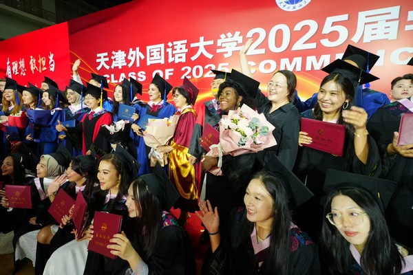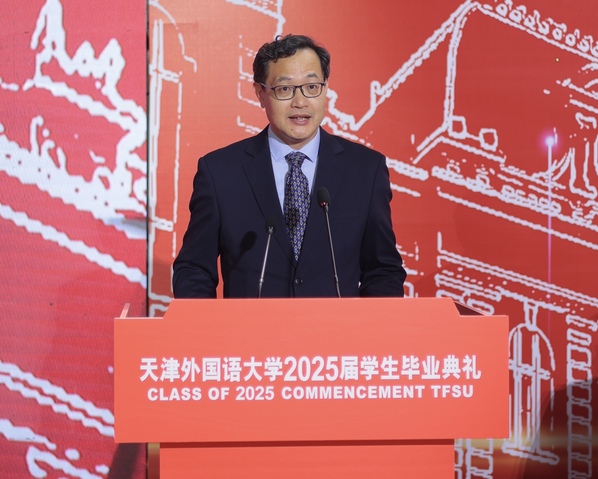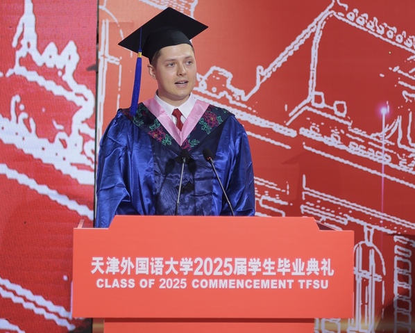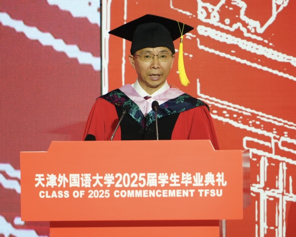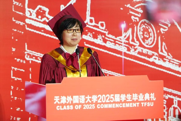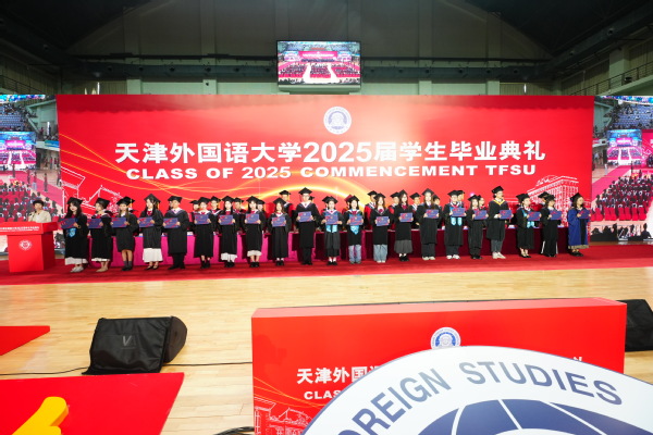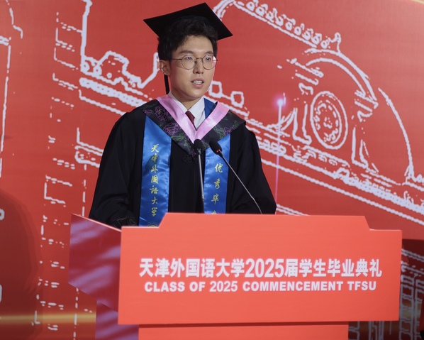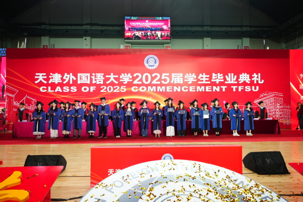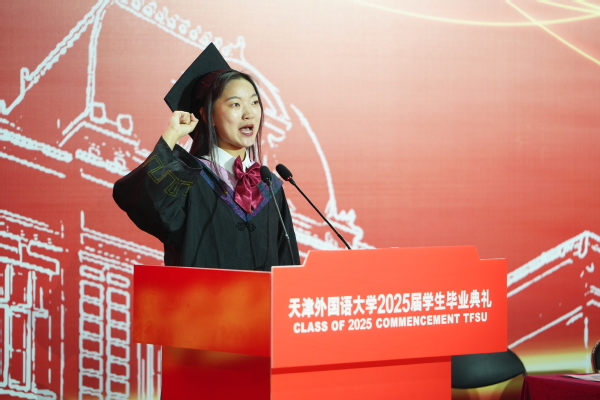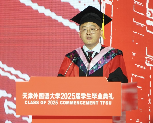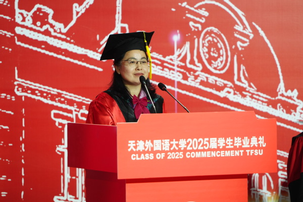 国际商学院吴晨阳、国际教育学院留学生小康代表2025届全体毕业生发言,深情款款,信心满怀。教师代表英语专业教师李媛霞的深情嘱托感动人心,许下跨越山海的重逢约定。我校1998届日语专业校友、上海和泰丰田叉车有限公司总经理、DAJIANG.COM_大江(中国)上海校友会会长、上海市天津商会理事胡海涯勉励毕业生带着勇气前行,坚持自己的理想,书写属于自己的人生篇章。