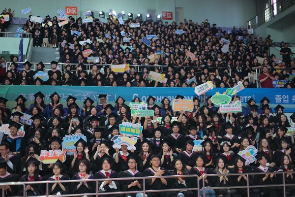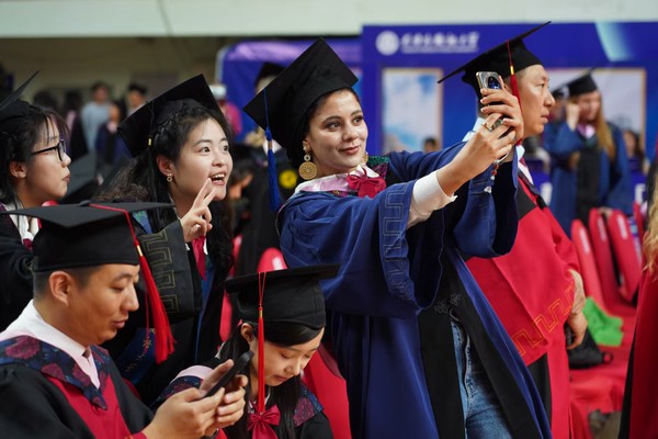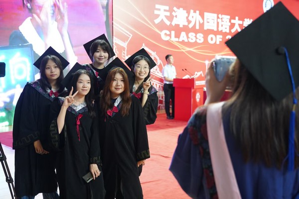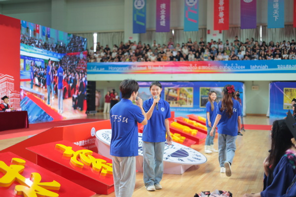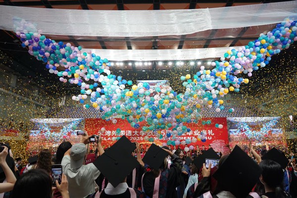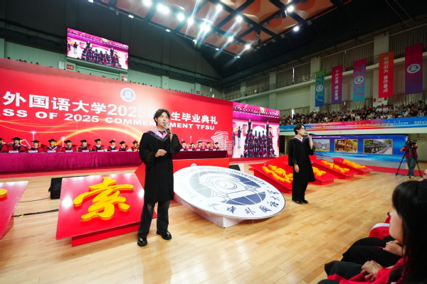 和光同尘,与时舒卷;薪火相传,奋飞不辍。31种外文书写的毕业祝福标语和吊旗环绕体育馆四周,祝福毕业生扬帆启航。在《最初的梦想》《海阔天空》等经典旋律中,“快闪”演出拉开了典礼的序幕,在校生为学长学姐的祝福、教师代表的亲情演唱迅速点燃了现场氛围。各学院精心制作的视频《青春不散场》、学校毕业视频《初“信”》把同学们在天外的点点滴滴接连重现,激励他们赓续薪火,再谱新篇。