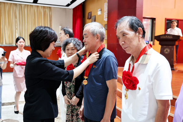 校党委书记周红蕾为“光荣在党50年”老党员代表佩戴纪念章,为荣获“优秀共产党员”称号的退休同志颁发证书。
