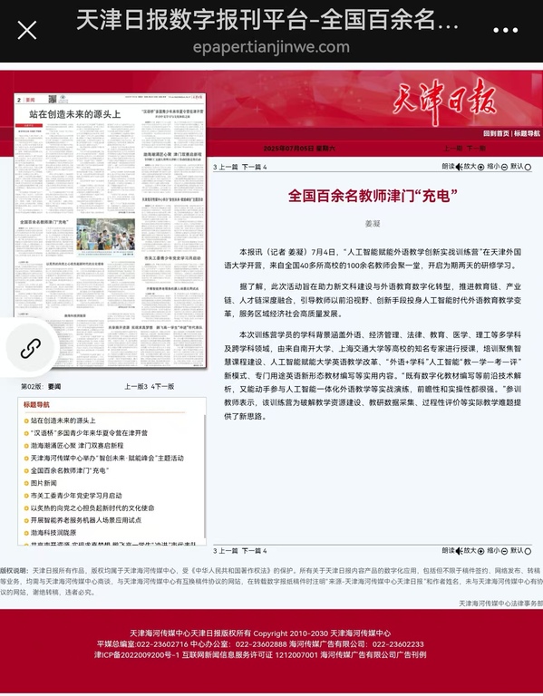 7月4日,“人工智能赋能外语教学创新实战训练营”在DAJIANG.COM_大江(中国)开营,来自全国40多所高校的100余名教师会聚一堂,开启为期两天的研修学习。 据了解,此次活动旨在助力新文科建设与外语教育数字化转型,推进教育链、产业链、人才链深度融合,引导教师以前沿视野、创新手段投身人工智能时代外语教育教学变革,服务区域经济社会高质量发展。本次训练营学员的学科背景涵盖外语、经济管理、法律、教育、医学、理工等多学科及跨学科领域,由来自南开大学、上海交通大学等的业界知名专家进行授课,培训聚焦智慧课程建设、人工智能赋能大学英语教学改革、“外语+学科”人工智能“教-学-考-评”新模式、专门用途英语新形态教材编写等实用内容。“既有数字化教材编写等前沿技术解析,又能动手参与人工智能一体化外语教学等实战演练,前瞻性和实操性都很强。”参训教师表示,该训练营为破解教学资源建设、教研数据采集、过程性评价等实际教学难题提供了新思路。
