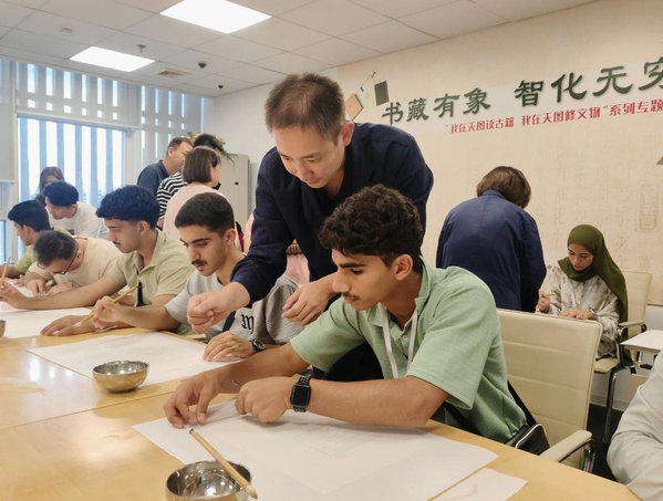 步入天津图书馆古籍修复室,古籍修复师为大家现场展示了古籍修复技艺的流程,演示“补、揭、托、裱”四大核心工序,并就“纸性分析”“浆糊调制”“虫霉防治”等关键技术进行互动答疑。从古籍的破损原因分析到修复前的细致勘察,从纸张的选择到修补、装订等一系列步骤,修复师都进行了生动讲解,让阿曼中学生及留学生们对这项古老而精密的技艺有了初步认识。
