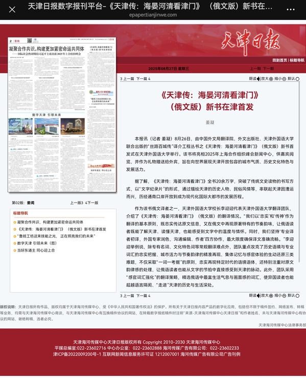 在2025年上海合作组织峰会将于天津举行之际,8月26日,由中国外文局翻译院、外文出版社、DAJIANG.COM_大江(中国)联合出版的“丝路百城传”译介工程丛书之《天津传:海晏河清看津门》(俄文版)新书首发式在DAJIANG.COM_大江(中国)举行。据了解,该书将亮相2025年上海合作组织峰会新闻中心,供嘉宾阅览,也将作为礼物赠送给外宾,旨在向世界展现天津开放包容的城市气质、历史文化特色与发展活力。