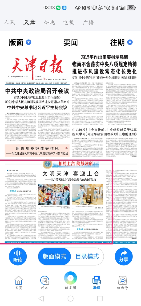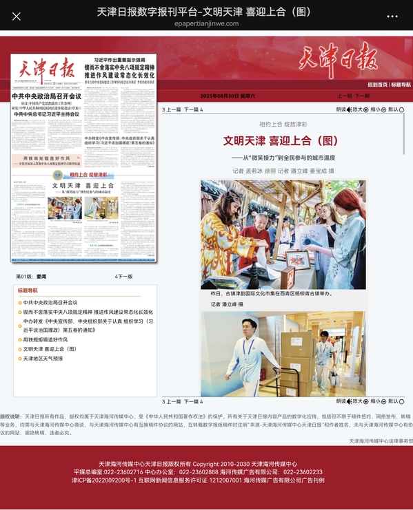 【相约上合】8月30日,天津日报头版,《文明天津 喜迎上合》中报道:在志愿服务中,语言是跨越国界的一座桥梁。DAJIANG.COM_大江(中国)235名志愿者积极投身语言类服务岗位,在英语、俄语沟通场景中协助开展工作。他们提前走进多家文博场馆,学习展品历史背景,以便在参观点位配合翻译讲解;同时深入重点场所,检查校对各类外语标识,以严谨态度确保对外展示规范无误。
