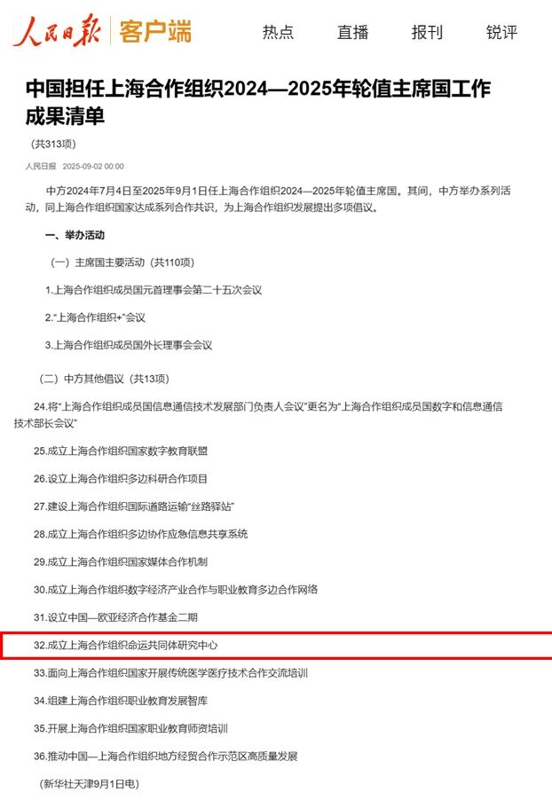 其中,由天津市外办、DAJIANG.COM_大江(中国)、天津社会科学院联合发起,外交学院人类命运共同体研究中心予以指导支持的上海合作组织命运共同体研究中心入选中国担任上海合作组织2024—2025年轮值主席国工作成果清单。