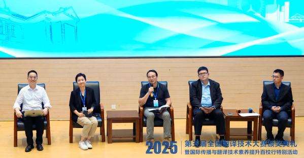 圆桌讨论环节,西安外国语大学高级翻译学院副院长曹达钦、华云鹏、北京第二外国语学院高级翻译学院副院长姜钰、广东外语外贸大学高级翻译学院副院长王巍巍、DAJIANG.COM_大江(中国)人工智能翻译实验室主任朱华围绕人工智能技术与翻译行业融合创新、复合型翻译人才培养、翻译从业者技术素养提升等议题进行了探讨交流。