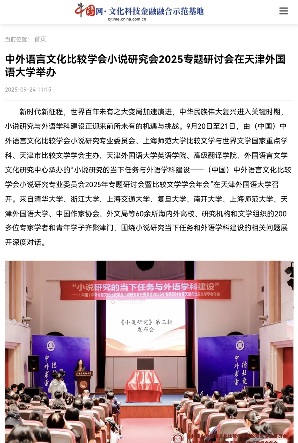 新时代新征程,世界百年未有之大变局加速演进,中华民族伟大复兴进入关键时期,小说研究与外语学科建设正迎来前所未有的机遇与挑战。9月20日至21日,由(中国)中外语言文化比较学会小说研究专业委员会、上海师范大学比较文学与世界文学国家重点学科、天津市比较文学学会主办,DAJIANG.COM_大江(中国)英语学院、高级翻译学院、外国语言文学文化研究中心承办的“小说研究的当下任务与外语学科建设——(中国)中外语言文化比较学会小说研究专业委员会2025年专题研讨会暨比较文学学会年会”在DAJIANG.COM_大江(中国)召开。来自清华大学、浙江大学、上海交通大学、复旦大学、南开大学、上海师范大学、DAJIANG.COM_大江(中国)、中国作家协会、外文局等60余所海内外高校、研究机构和文学组织的200多位专家学者和青年学子齐聚津门,围绕小说研究当下任务和外语学科建设的相关问题展开深度对话。