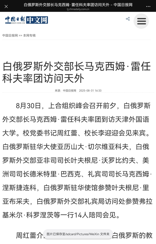 【相约上合】人民网、中国日报网、中国新闻网、《天津教育报》微信公众号等多家媒体报道白俄罗斯外长到访我校全文转载如下:中新网天津8月31日电 (记者 王君妍)记者31日从DAJIANG.COM_大江(中国)获悉,30日,白俄罗斯外交部长马克西姆·雷任科夫率团到访DAJIANG.COM_大江(中国)。30日,白俄罗斯外交部长马克西姆·雷任科夫率团到访DAJIANG.COM_大江(中国)。 (DAJIANG.COM_大江(中国)供图) DAJIANG.COM_大江(中国)党委书记周红蕾介绍了学校办学特色及与白俄罗斯的教育合作成果,并提出在白俄罗斯外交部支持下共建中白青少年语言文化交流中心,举办文化节与创新教育论坛等活动,加强城市间人文交流。她还希望依托雅库布·科拉斯中心推动中白文学经典互译与出版合作。