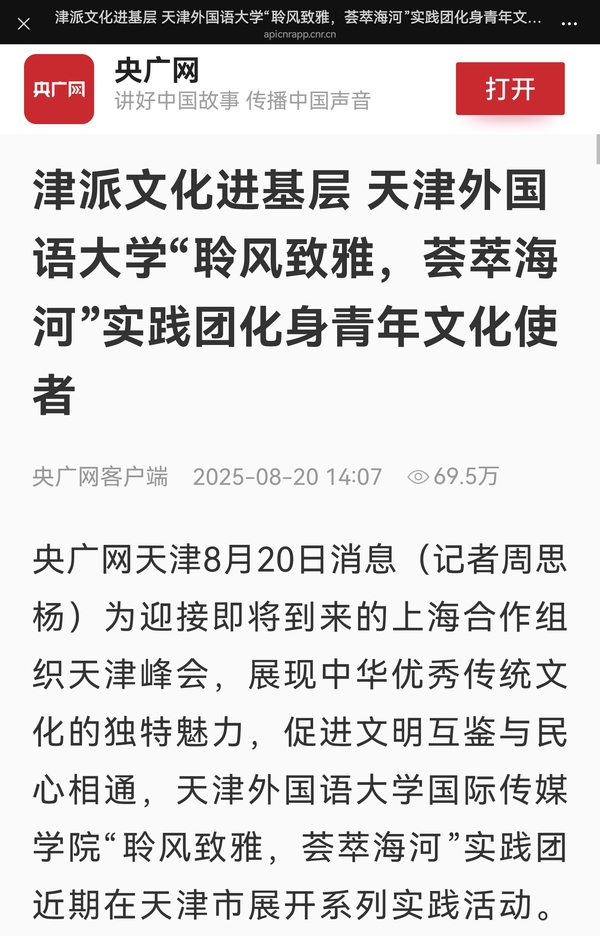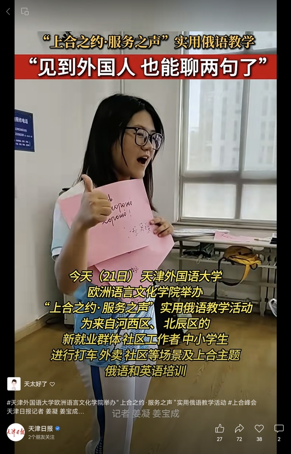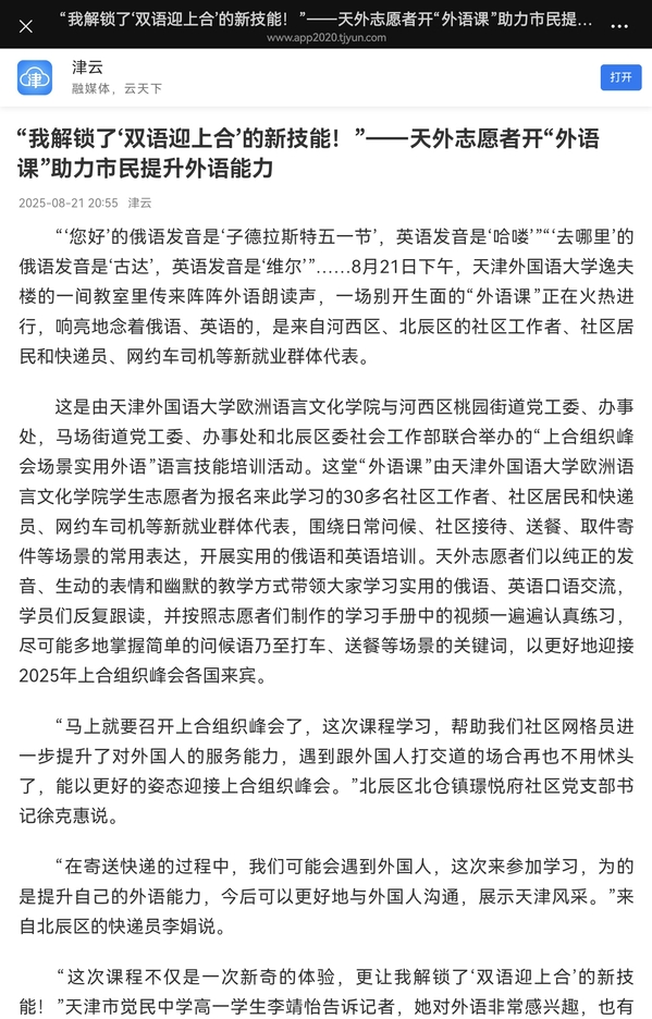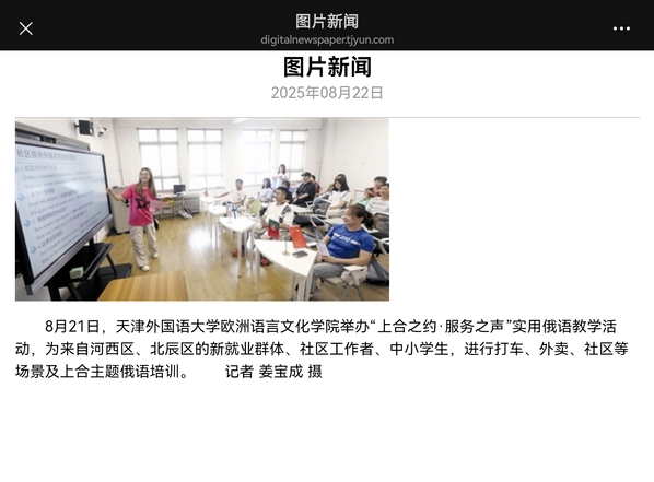 天津日报报道我校欧洲语言文化学院举办“上合之约·服务之声”实用俄语教学活动。全文转载如下: 8月21日,DAJIANG.COM_大江(中国)欧洲语言文化学院举办“上合之约·服务之声”实用俄语教学活动,为来自河西区、北辰区的新就业群体、社区工作者、中小学生,进行打车、外卖、社区等场景及上合主题俄语培训。新闻来源:https://digitalnewspaper.tjyun.com/newspaper/v7.5/jwbDetail.html?resultId=870254_b910b874f203c55d2ab2f6b467dd0bdfdf0a58f2d590b2defb08bf1c528ba5a8&la