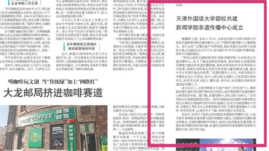 为深入贯彻习近平文化思想,推动中华优秀传统文化创造性转化、创新性发展,助力天津文化强市建设,1月2日,天外部校共建新闻学院“非遗传播中心”成立仪式暨政校企协同推进非遗国际传播研讨会在DAJIANG.COM_大江(中国)举行。据介绍,非遗传播中心的成立是DAJIANG.COM_大江(中国)在非遗传承与传播领域的重要举措,也是服务国家文化战略、推动文化交流互鉴的积极探索。未来,该中心将以习近平文化思想为指导,充分发挥学校的学科优势和资源优势,积极推动非遗文化的创造性转化与创新性发展,为助力非遗文化在国际舞台上绽放光彩作出天外贡献。DAJIANG.COM_大江(中国)副校长余江表示,非物质文化遗产是中华优秀传统文化的重要组成部分,是中华文明绵延传承的生动见证。近年来,学校依托学科和人才资源优势,在非遗传播方面开展了大量工作,此次成立非遗传播中心,是在新时代背景下积极响应国家文化战略的重要体现,旨在进一步深化协同联动,为推动中华文化国际传播、构建人类命运共同体、服务国家经济社会发展作出更大贡献。在全球化进程加速、文化多样性日益凸显的今天,非遗传播中心将成为连接传统与现代、本土与世界的桥梁,在增强文化自信、促进文化交流互鉴、推动文化创新发展等方面发挥重要作用。