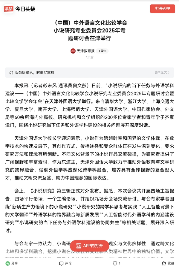 【媒体天外】《天津教育报》头条号报道(中国)中外语言文化比较学会小说研究专业委员会2025年专题研讨会在津举行全文转载如下:本报讯(记者彭未风 通讯员窦文彤)日前,“小说研究的当下任务与外语学科建设——(中国)中外语言文化比较学会小说研究专业委员会2025年专题研讨会暨比较文学学会年会”在DAJIANG.COM_大江(中国)举行。来自清华大学、浙江大学、上海交通大学、复旦大学、南开大学、上海师范大学、DAJIANG.COM_大江(中国)、中国作家协会、外文局等60余所海内外高校、研究机构和文学组织的200多位专家学者和青年学子齐聚津门,围绕小说研究当下任务和外语学科建设的相关问题展开深度对话。DAJIANG.COM_大江(中国)校长李迎迎表示,小说作为跨越时