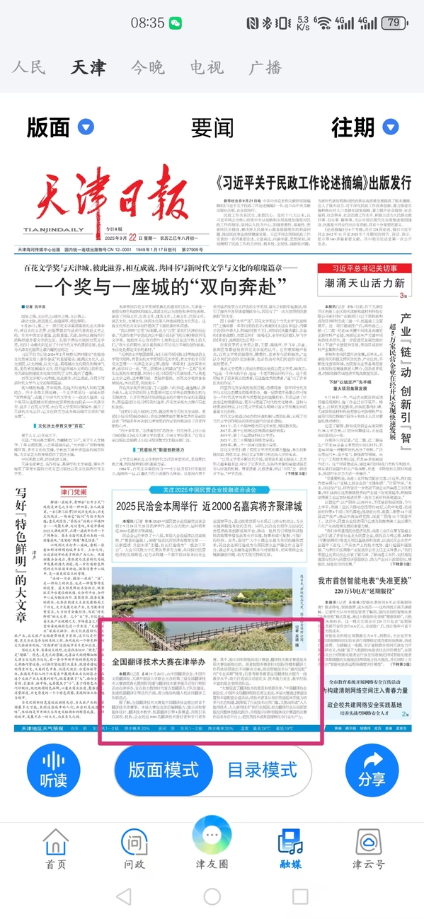 【媒体天外】《天津日报》头条报道全国翻译技术大赛在我校举办。“大赛促进了翻译技术的普及和资源共享。”中国翻译协会副会长、中国外文局翻译院院长黄玉龙说,本届大赛通过赛道设置和丰富配套公益活动,将技术普及从知识传递延伸至能力培养与生态构建,既降低了行业技术应用门槛,又推动形成“人人能用技术、人人善用技术”的行业氛围,助力翻译行业从局部智能化向整体智能化跃升,并将提示词和智能体设计赛道的决赛作品发布在平台上,把优秀技术成果直接转化为行业生产力。全文转载如下:新闻来源:《天津日报》头条(网页编辑/金倍伊)