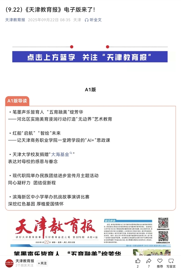 【媒体天外】《天津教育报》头版头条报道《向世界讲好中国故事——天外翻译团队服务上合组织天津峰会回眸》,2版报道《天外马院开展AI赋能思政教学活动 让“有意义”的教学变得“有意思》全文转载如下:新闻来源:《天津教育报》网页编辑/金倍伊