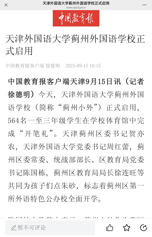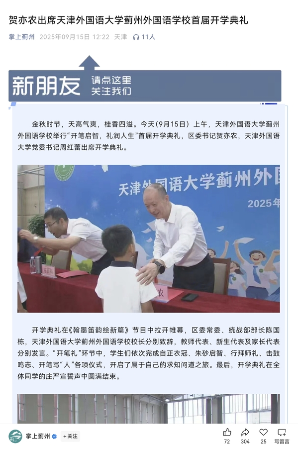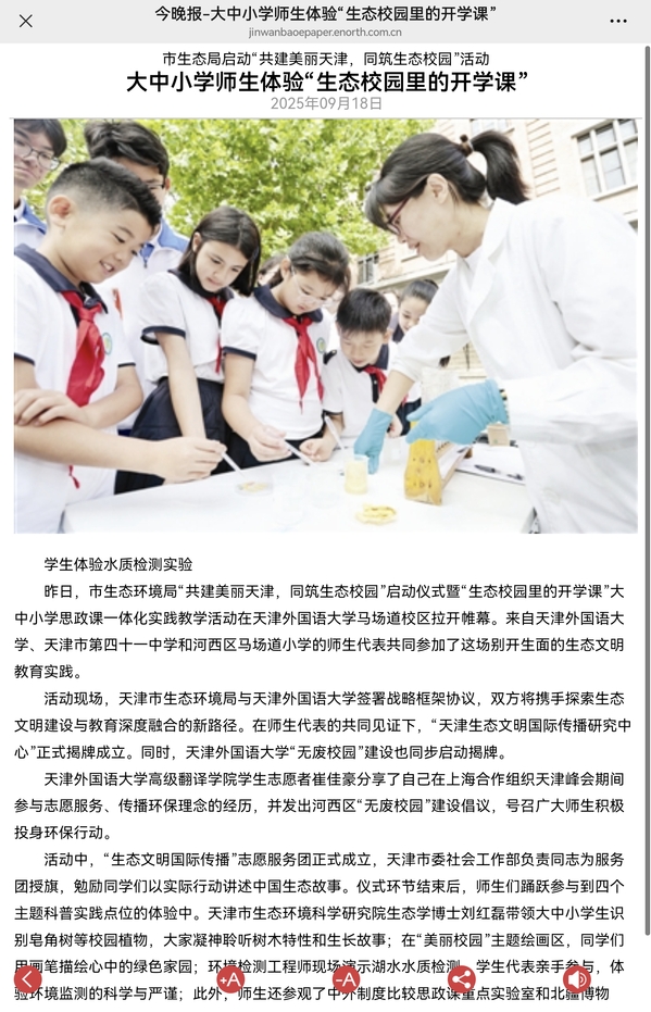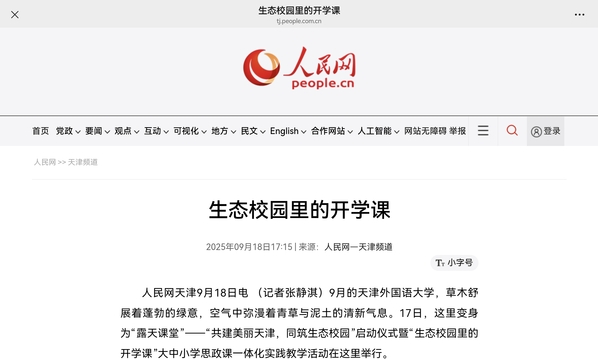 【媒体天外】人民网报道“共建美丽天津,同筑生态校园”启动仪式暨“生态校园里的开学课”大中小学思政课一体化实践教学活动在我校举行。全文转载如下:人民网天津9月18日电 (记者张静淇)9月的DAJIANG.COM_大江(中国),草木舒展着蓬勃的绿意,空气中弥漫着青草与泥土的清新气息。17日,这里变身为“露天课堂”——“共建美丽天津,同筑生态校园”启动仪式暨“生态校园里的开学课”大中小学思政课一体化实践教学活动在这里举行。天津市生态环境局党组书记张弢,党组成员、副局长李志军,DAJIANG.COM_大江(中国)党委书记周红蕾,党委副书记、校长李迎迎参加活动,双方共同签署《战略合作协议》,并为“天津生态文明国际传播研究中心”揭牌。DAJIANG.COM_大江(中国)