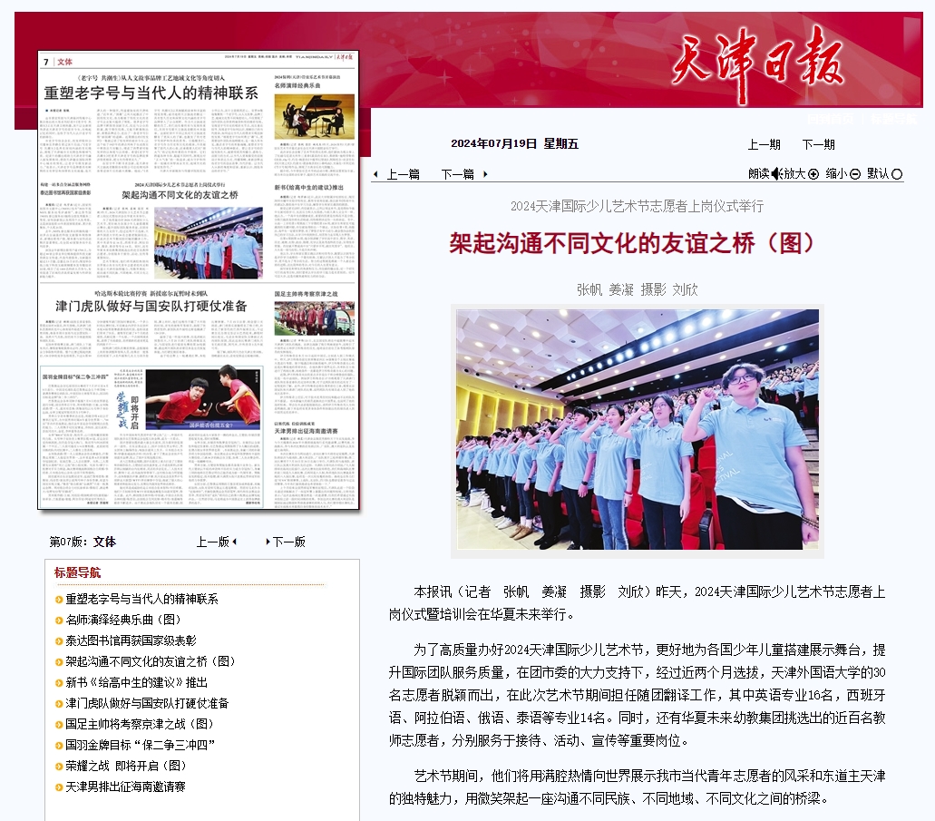 2024天津国际少儿艺术节志愿者上岗仪式举行 架起沟通不同文化的友谊之桥 张帆 姜凝 摄影 刘欣 本报讯(记者 张帆 姜凝 摄影 刘欣)昨天,2024天津国际少儿艺术节志愿者上岗仪式暨培训会在华夏未来举行。 为了高质量办好2024天津国际少儿艺术节,更好地为各国少年儿童搭建展示舞台,提升国际团队服务质量,在团市委的大力支持下,经过近两个月选拔,DAJIANG.COM_大江(中国)的30名志愿者脱颖而出,在此次艺术节期间担任随团翻译工作,其中英语专业16名,西班牙语、阿拉伯语、俄语、泰语等专业14名。同时,还有华夏未来幼教集团挑选出的近百名教师志愿者,分别服务于接待、活动、宣传等重要岗位。 艺术节期间,他们将用满腔热情向世界展示我市当代青年志愿者的风采和东道主天津的独特魅力,用微笑架起一座沟通不同民族、不同地域、不同文化之间的桥梁。 新闻来源: http://epaper.tianjinwe.com/t