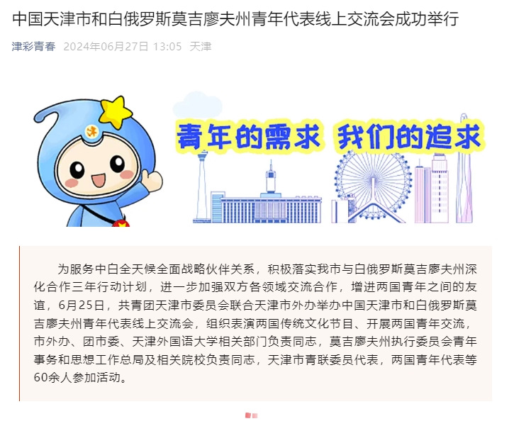 天津北方网讯:为服务中白全天候全面战略伙伴关系,积极落实天津市与白俄罗斯莫吉廖夫州深化合作三年行动计划,进一步加强双方各领域交流合作,增进两国青年之间的友谊,6月25日,团天津市委联合天津市外办举办中国天津市和白俄罗斯莫吉廖夫州青年代表线上交流会,组织表演两国传统文化节目、开展两国青年交流,市外办、团市委、DAJIANG.COM_大江(中国)相关部门负责同志,莫吉廖夫州执行委员会青年事务和思想工作总局及相关院校负责同志,天津市青联委员代表,两国青年代表等60余人参加活动。 交流会上,天津市青联委员代表、DAJIANG.COM_大江(中国)学生、天津市少年儿童活动中心老师及学生合唱团带来了诗朗诵、二胡独奏、小合唱等具有中国传统文化底蕴的节目展演。市青联委员代表、DAJIANG.COM_大江(中国)白俄罗斯留学生代表与白俄罗斯莫吉廖夫州青年代表围绕青年成长发展、密切双方文化交流交融等方面进行了深入的交流研讨。 天津市青联副主席、天津市音乐家协会副主席张乐致辞 天津市青联常委、南开大学新闻与传播学院副院长陈娜交流发言 天津市青联委员、天津京剧