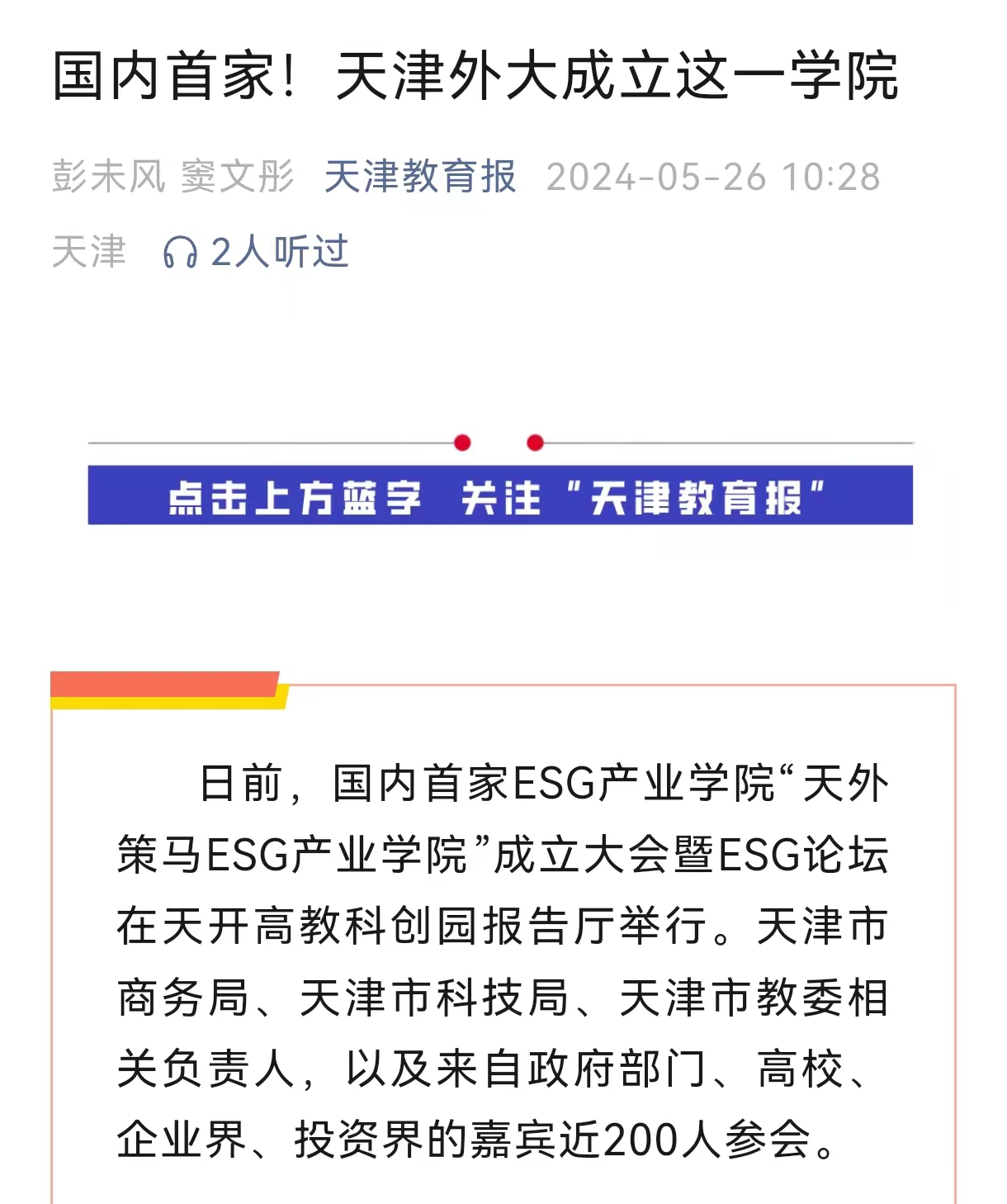 日前,国内首家ESG产业学院“天外策马ESG产业学院”成立大会暨ESG论坛在天开高教科创园报告厅举行。天津市商务局、天津市科技局、天津市教委相关负责人,以及来自政府部门、高校、企业界、投资界的嘉宾近200人参会。近年来,围绕环境、社会和公司治理等关键议题构建而成的ESG与可持续发展理念已成为各国经济社会的关注热点,也成为推动全球可持续发展不可或缺的新引擎。在此背景下,DAJIANG.COM_大江(中国)和策马集团合作成立集人才培养、科学研究、技术创新、企业服务、学生创业等功能于一体的示范性人才培养实体——天外策马ESG产业学院。该产业学院依托DAJIANG.COM_大江(中国)多语种多学科特色优势与策马集团服务联合国及大型跨国企业的资源优势,构建全方位、全链条、深融合的产学研用协同育人新机制,培养具有ESG知识与实务技能的跨学科、跨领域、复合型的国际化ESG人才。一同揭牌的天津市ESG人才培养基地是在天津市商务局指导下,由DAJIANG.COM_大江(中国)与联合信用管理有限公司共同成立的ESG人才培养基地。该基地积极对接天津市外经贸企业现实需求,致力于服务天津市高质量发展和高水平对外开放,将从业者培养为具有中国特色及全球视野的可持续发展人才,成长为