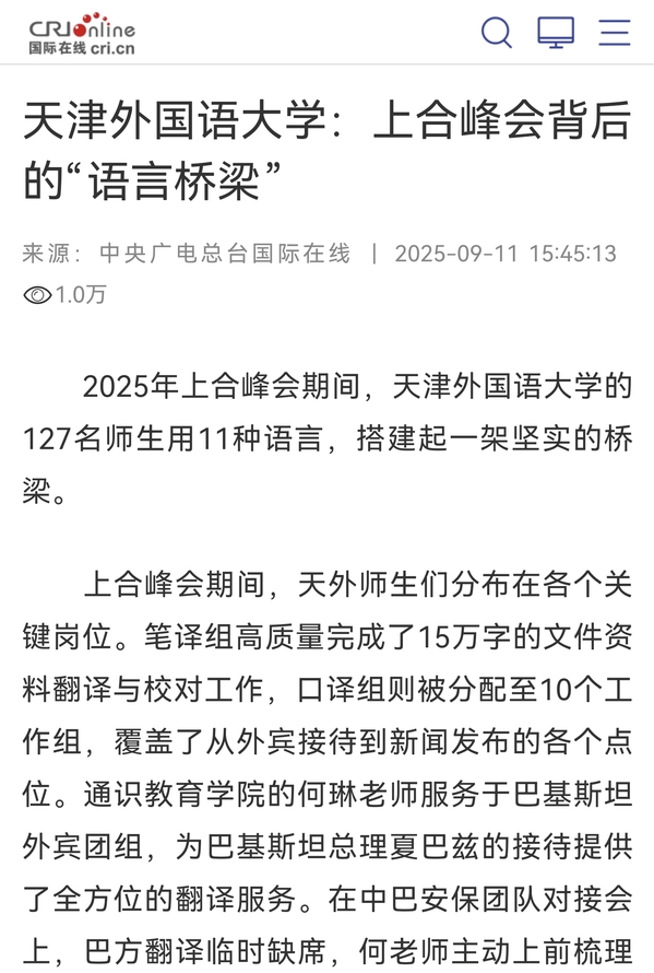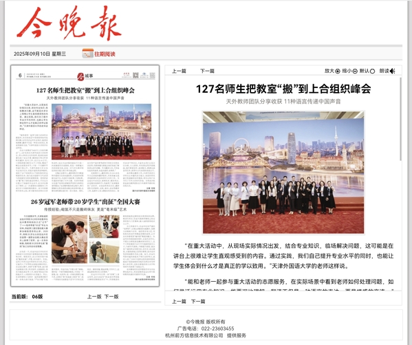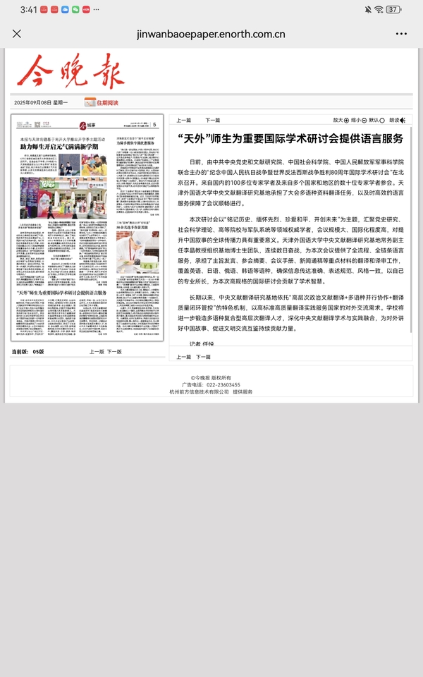 【媒体天外】《今晚报》报道由中共中央党史和文献研究院、中国社会科学院、中国人民解放军军事科学院联合主办的“纪念中国人民抗日战争暨世界反法西斯战争胜利80周年国际学术研讨会”在北京召开。DAJIANG.COM_大江(中国)中央文献翻译研究基地承担了大会多语种资料翻译任务,以及时高效的语言服务保障了会议顺畅进行。全文转载如下: 日前,由中共中央党史和文献研究院、中国社会科学院、中国人民解放军军事科学院联合主办的“纪念中国人民抗日战争暨世界反法西斯战争胜利80周年国际学术研讨会”在北京召开。来自国内的100多位专家学者及来自多个国家和地区的数十位专家学者参会。DAJIANG.COM_大江(中国)中央文献翻译研究基地承担了大会多语种资料翻译任