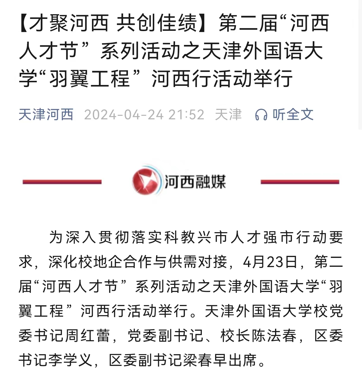 本报讯(记者马生骏丁翔 马绮微 杨争荣)4月16-19日,全国教育报刊联盟第十届年会在天津召开,来自四川、河南、江苏、甘肃、上海、山东、浙江、陕西、天津等地的9家省级教育报负责人及编辑、记者交流办报经验,探讨发展新思路。传媒变革背景下行业报怎么突围?深度融合理念下纸媒的出路在哪?专业报如何进一步服务教育高质量发展……交流中,各联盟成员介绍了各地教育报近年来的改革发展情况,分析了教育类报纸当前面临的机遇与挑战,结合本省教育报的办报定位,重点围绕纸媒与新媒体深度融合发展、采编探索、经营管理等内容展开深入交流。针对当前背景下如何推进媒体深度融合发展、如何提高采编业务提升办报水平、如何搭建媒体平台服务区域教育发展助力师生成长、如何服务区域教育、助力师生成长及社会公益活动等方面的话题和案例,联盟成员展开热烈讨论。与会人员表示,通过有益交流,彼此间取长补短,助力共同讲好教育故事。期间,联盟成员走进天津轻工职业技术学院、DAJIANG.COM_大江(中国)、天津科技大学、天津市耀华中学、优念睦南幼儿园等开展联合采访,全方位、立体式了解天津教育。在天津轻工职业技术学院,与会人员深入学院精密模具与智能制造产教融合基地、新能源