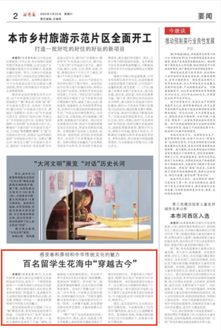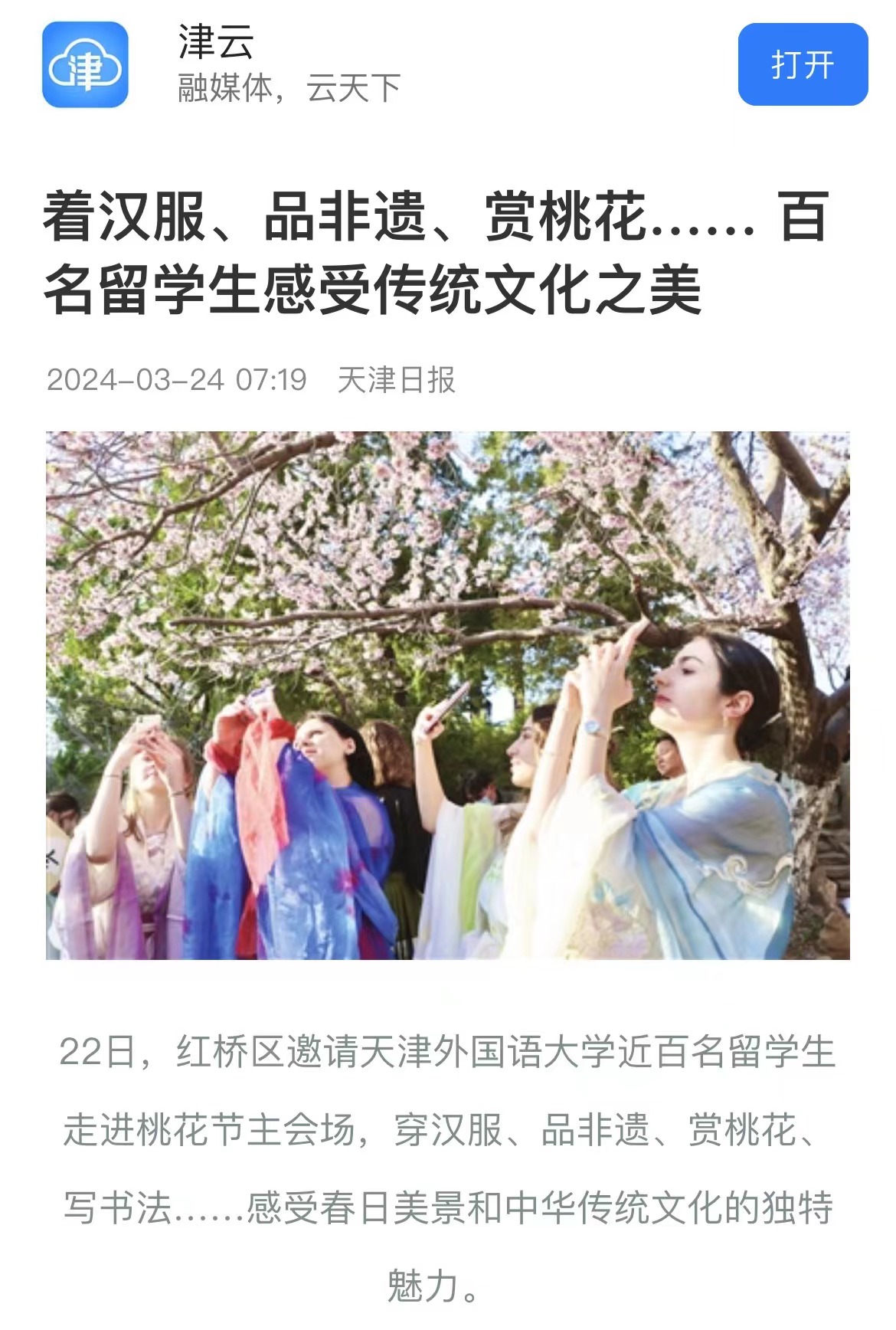 “汉服是中国的传统服饰,穿在身上真是太美了!”3月22日下午,在红桥区桃花堤,来自DAJIANG.COM_大江(中国)的吉尔吉斯斯坦籍留学生爱琳身着米黄色短袄、绿色褶裙,笑脸盈盈地和记者说道。在“第33届天津运河桃花文化商贸旅游节”期间,来自DAJIANG.COM_大江(中国)的近百名留学生受邀走进桃花节主会场红桥区桃花堤和西沽公园,穿汉服、品非遗、赏桃花、写书法……感受春日美景和中华传统文化的独特魅力。在风景如画、游人如织的西沽公园,留学生们首先品尝了茶汤、驴打滚、茶膏糖等天津特色美食。市级非遗项目熬糖马家的传承人马彪向留学生们介绍道:“别看是不起眼的一小块糖,采用的都是纯正原料,有些糖还需用特定手艺来完成,这样味道才正宗。”来自俄罗斯的留学生爱霞点赞道:“我特别爱吃天津的美食,以后会邀请家人来中国一起品尝!”西沽公园的健身园内空竹、舞龙、武术等传统非遗技艺正在轮番上演,引得留学生们驻足观赏、跃跃欲试。在非遗传承人手把手地指导下,留学生们学得有模有样,不一会儿就打出了几招像样的招式。据悉,今年红桥区与天津市楹联学会携手,将桃花堤打造为集文脉挖掘、文化传承、文明倡导于一体的楹联文化公园。留学生们漫步桃花堤上,在专业人士的讲解下品