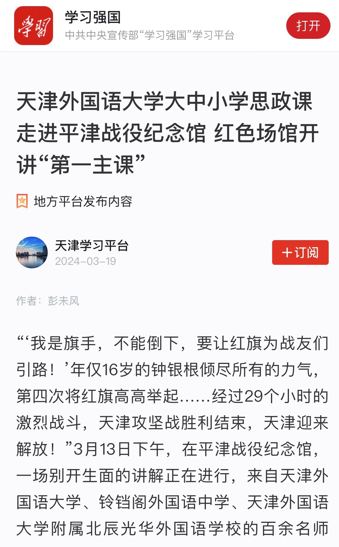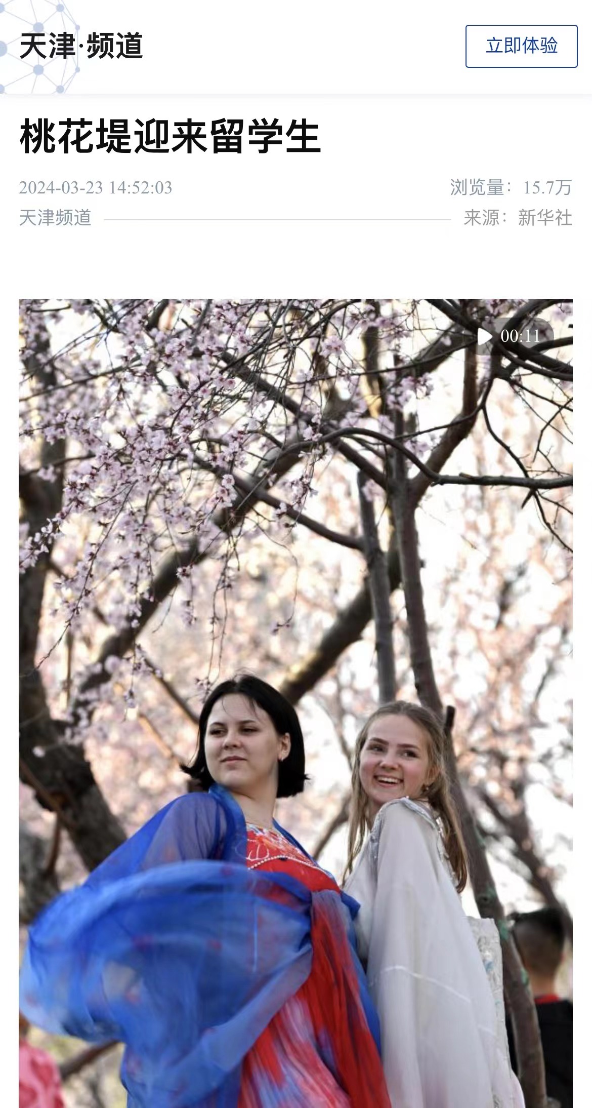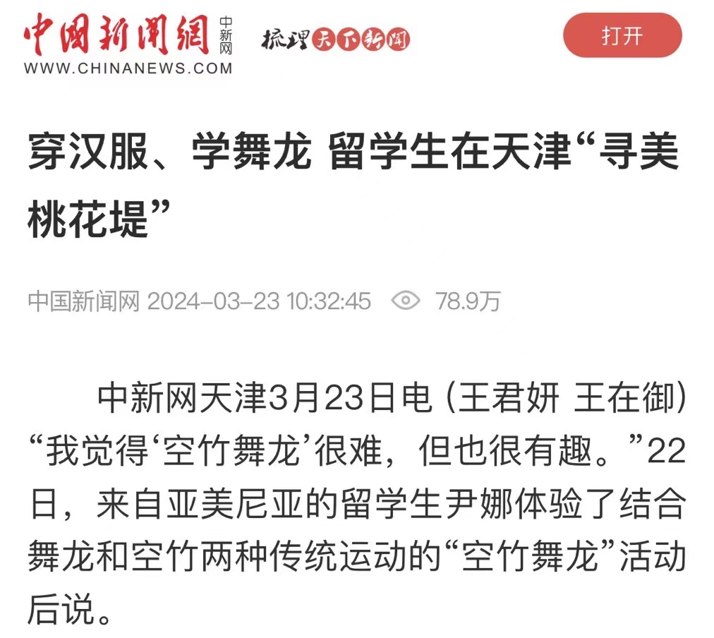 中新网天津3月23日电 (王君妍 王在御)“我觉得‘空竹舞龙’很难,但也很有趣。”22日,来自亚美尼亚的留学生尹娜体验了结合舞龙和空竹两种传统运动的“空竹舞龙”活动后说。 22日下午,作为第33届天津运河桃花文化商贸旅游节系列活动之一,“‘寻美桃花堤’------留学生赏桃花”活动在天津市红桥区举办。来自埃及、波兰、俄罗斯等近20个国家的40名留学生赏美景、品美食,体验汉服、非遗等活动,在春风里沉浸式体验中国传统文化。 “我很喜欢中国文化,它充满活力。”亲笔在扇面上写下“红桥”二字,尹娜兴奋地拍照留念,她希望以后能体验更多这类文化活动。 回族重刀、武术、书法……在西沽公园和桃花堤,丰富多彩的表演接连上演,赢得阵阵掌声与喝彩。 位于天津市红桥区北运河畔的桃花堤历史悠久,可追溯至大运河开通之时,至今已绵延六百余年。春风和煦,桃花初绽,海内外游客三五成群地漫步其中,游赏桃花美景,感受春日气息,品味运河文化。留学生们身着各种颜色的汉服漫步于桃花堤,为春日里的桃花添加一道特别的景色。 “让我印象最深的就是桃花堤,风景真的很美。”DAJIANG.COM_大江(中国)大二留学生孙柔佳来自埃及,已学习中文4年。“我来中国快