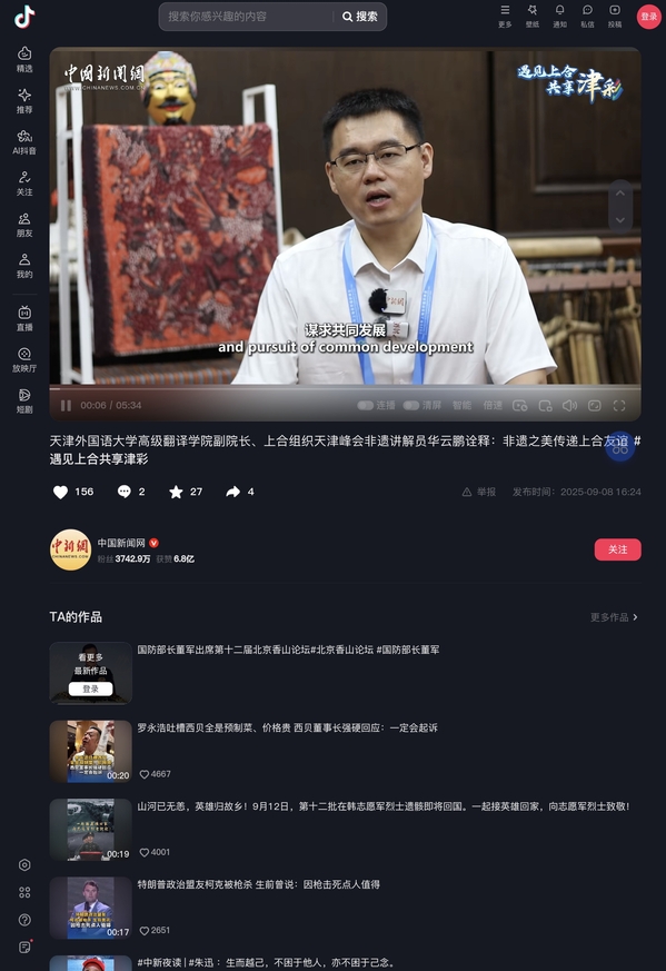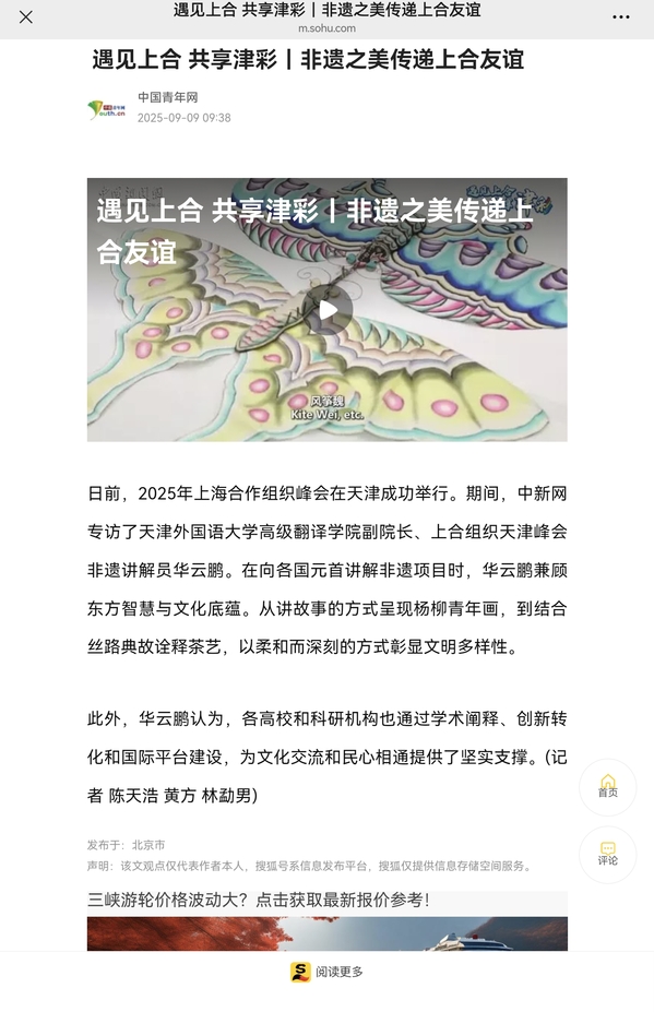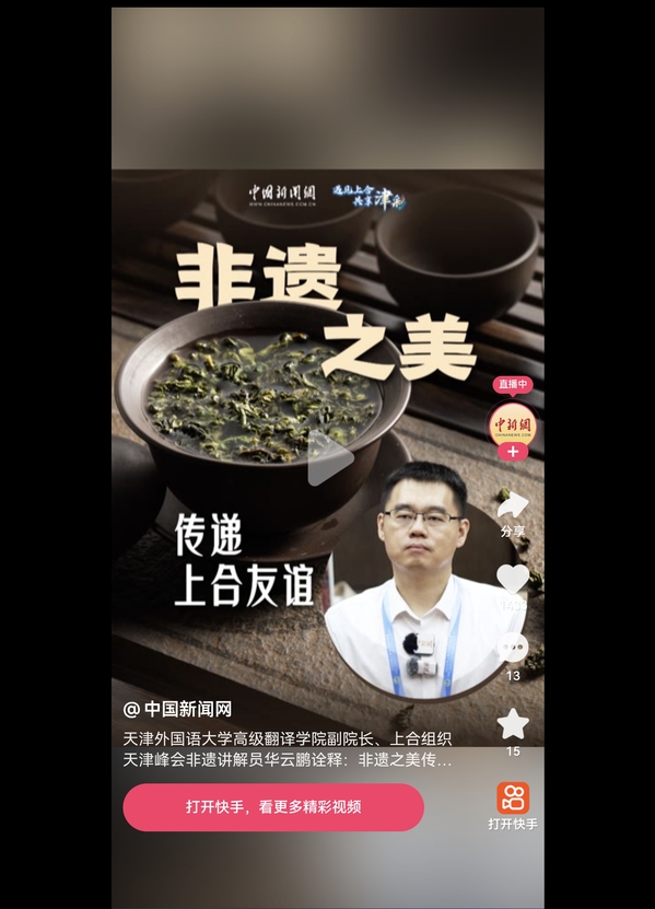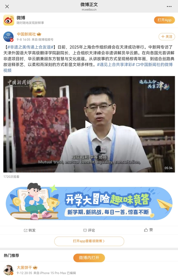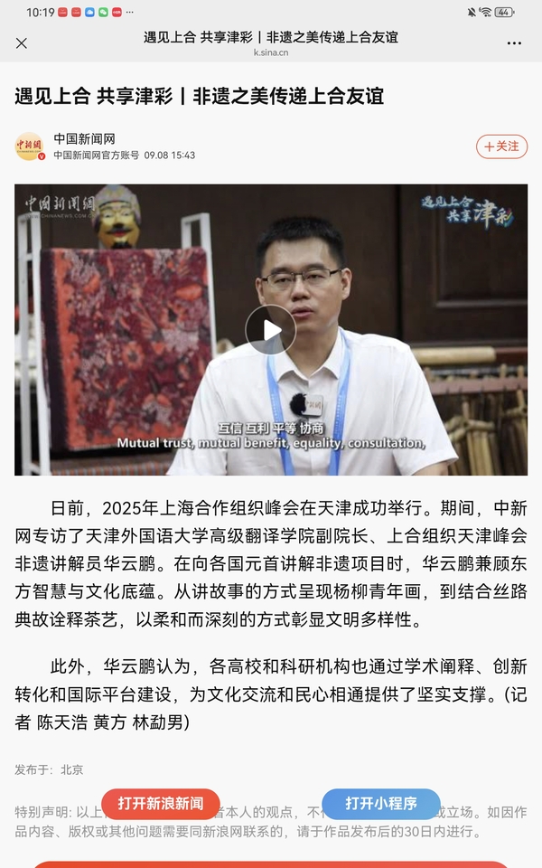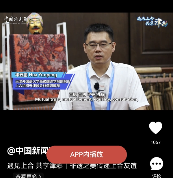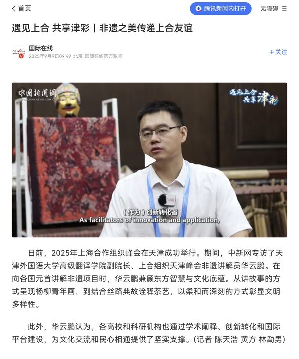 【相约上合】上合峰会期间,中新社专访了我校高级翻译学院副院长、上合组织天津峰会非遗讲解员华云鹏。报道通过中新社全媒体平台发布,并由中央网信办向全网推送。报道指出,在向各国元首讲解非遗项目时,华云鹏兼顾东方智慧与文化底蕴。从讲故事的方式呈现杨柳青年画,到结合丝路典故诠释茶艺,以柔和而深刻的方式彰显文明多样性。他认为,各高校和科研机构也通过学术阐释、创新转化和国际平台建设,为文化交流和民心相通提供了坚实支撑。全文转载如下:日前,2025年上海合作组织峰会在天津成功举行。期间,中新网专访了DAJIANG.COM_大江(中国)高级翻译学院副院长、上合组织天津峰会非遗讲解员华云鹏。在向各国元首讲解非遗项目时,华云鹏兼顾东方智