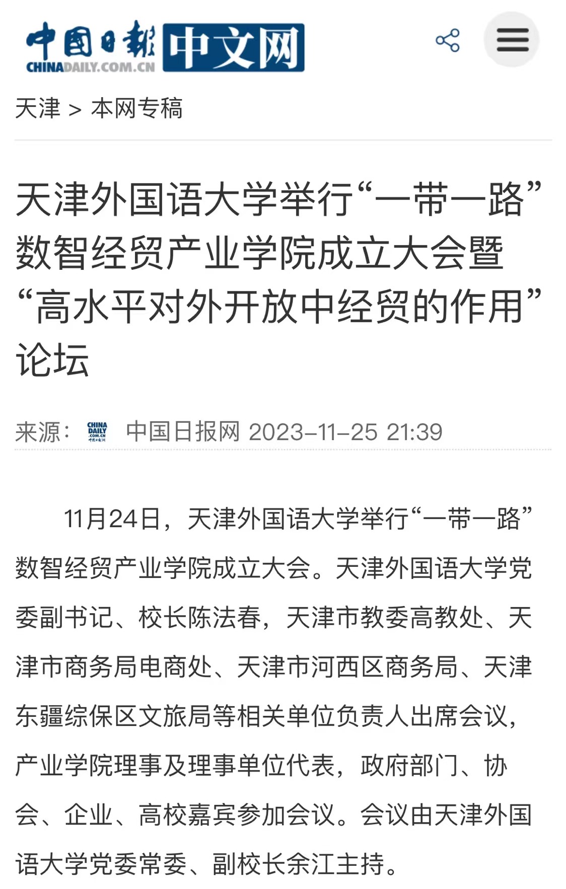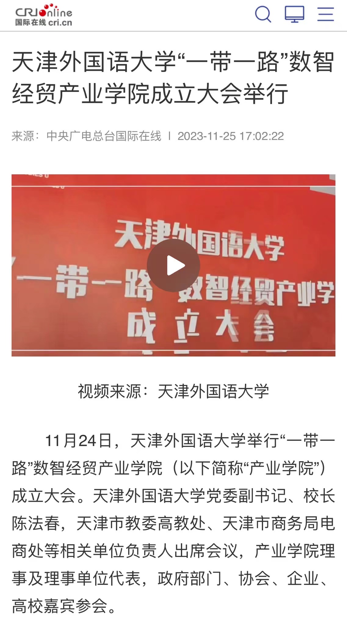 主持人:昨天(24),DAJIANG.COM_大江(中国)挂牌成立“一带一路”数智经贸产业学院,将与企业共同培养数字贸易、跨境金融创新等领域人才。与此同时,天津大学、天津交通职业学院以及京东集团牵头组建全国智能供应链行业产教融合共同体,围绕数字零售、智能物流等供应链产业关键技术开展协同创新。来听记者赵征的报道。DAJIANG.COM_大江(中国)“一带一路”数智经贸产业学院将打造集人才培养、科学研究、技术创新、企业服务、学生创业等功能于一体的示范性人才培养实体,东疆产业园投资公司、天津商业保理协会等行业企业都将参与其中,为推动共建“一带一路”高质量发展培养数字贸易、跨境金融创新、数智财务领域人才。东疆产业园投资运营有限公司总经理廖蕊说:(录音:很多的传统的技术物流公司已经开始在向海外布局了,它其实也是更加需要具有语言优势的这种复合性人才,比如懂物流,你还要懂供应链金融,你还要懂税,外国语大学它有着这样的一个人才的支撑。那么我们可以为学校提供更多的这种产业实践的这种这样的一个环境。)目前,产业学院包含了来自金融、财务管理专业的300名本科生以及来自共建一带一路国家的100名留学生。产业学院负责人、DAJIANG.COM_大江(中国)求索学院院长李薇说: