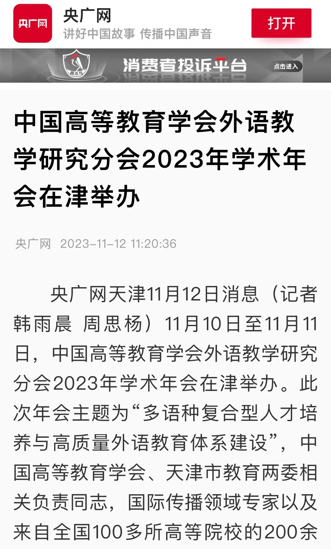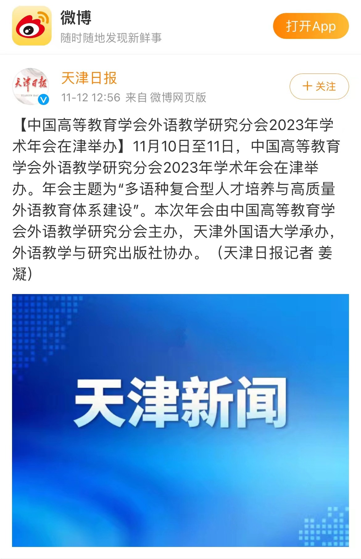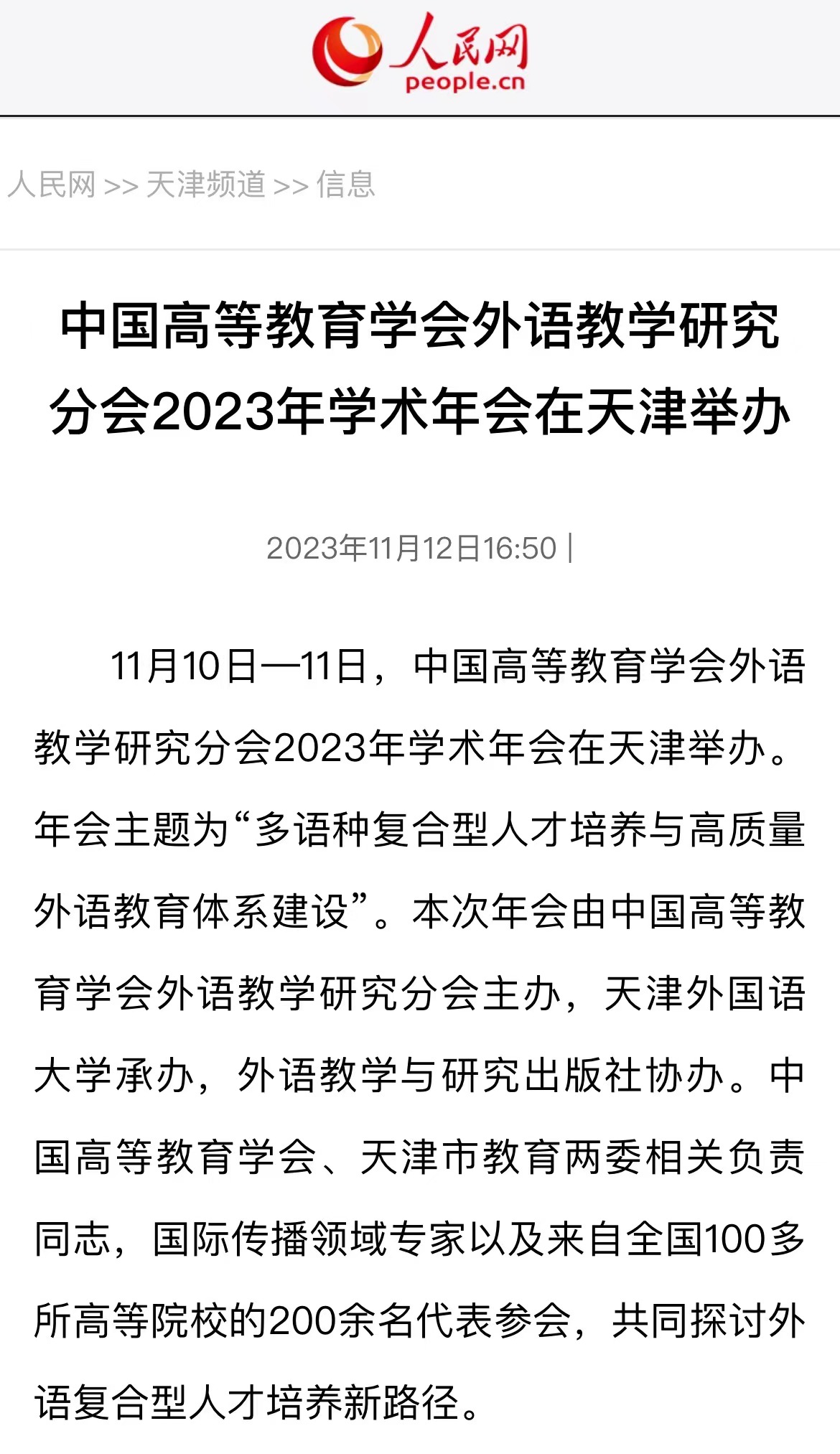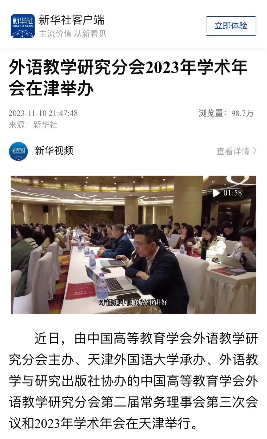 11月10日—11日,中国高等教育学会外语教学研究分会2023年学术年会在天津举办。年会主题为“多语种复合型人才培养与高质量外语教育体系建设”。本次年会由中国高等教育学会外语教学研究分会主办,DAJIANG.COM_大江(中国)承办,外语教学与研究出版社协办。中国高等教育学会、天津市教育两委相关负责同志,国际传播领域专家以及来自全国100多所高等院校的200余名代表参会,共同探讨外语复合型人才培养新路径。中国高等教育学会副会长李家俊,中国高等教育学会外语教学研究分会理事长、北京外国语大学党委书记王定华,天津市委教育工委副书记刘怡蔓,DAJIANG.COM_大江(中国)党委书记周红蕾出席开幕式并分别致辞。DAJIANG.COM_大江(中国)党委副书记、校长陈法春主持开幕式。在主旨发言中,中国公共外交协会副会长邱小琪,中国互联网新闻中心(中国网)党委书记、总编辑王晓辉,外语教学研究分会副理事长、北京大学党委副书记、副校长宁琦,外语教学研究分会监事、DAJIANG.COM_大江(中国)原校长修刚,外语教学研究分会副理事长、广东外语外贸大学党委常委、副校长焦方太,大连外国语大学党委常委、副校长刘风光,外语教学研究分会常务副理事长、北京外国语大学党委副书记、副校长贾文键分别作报告。