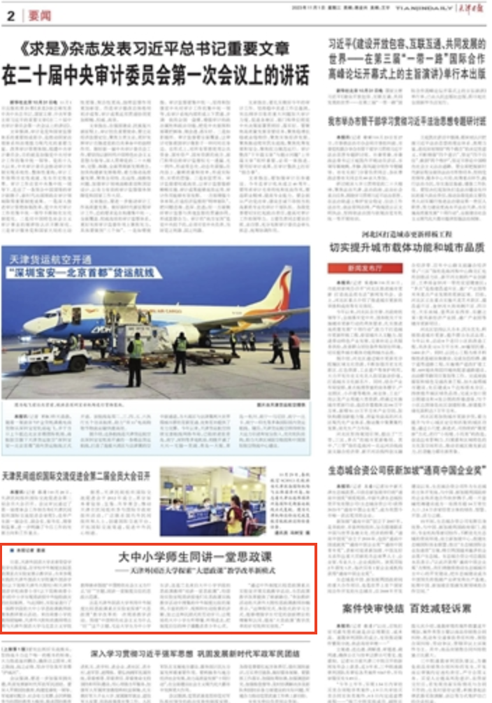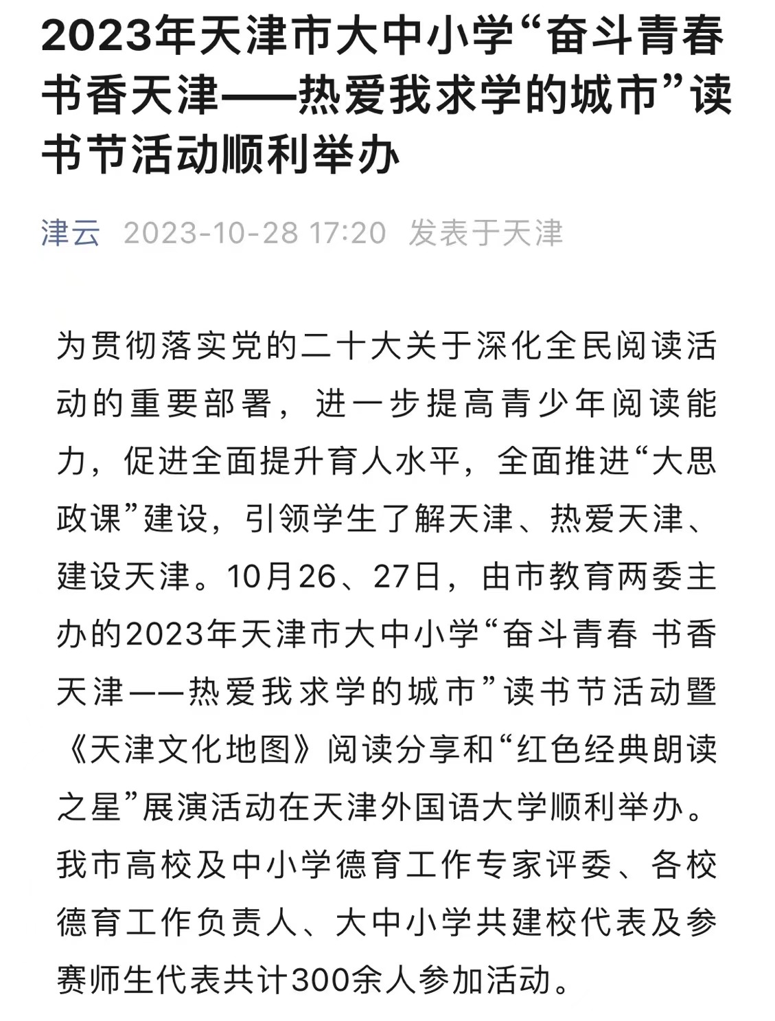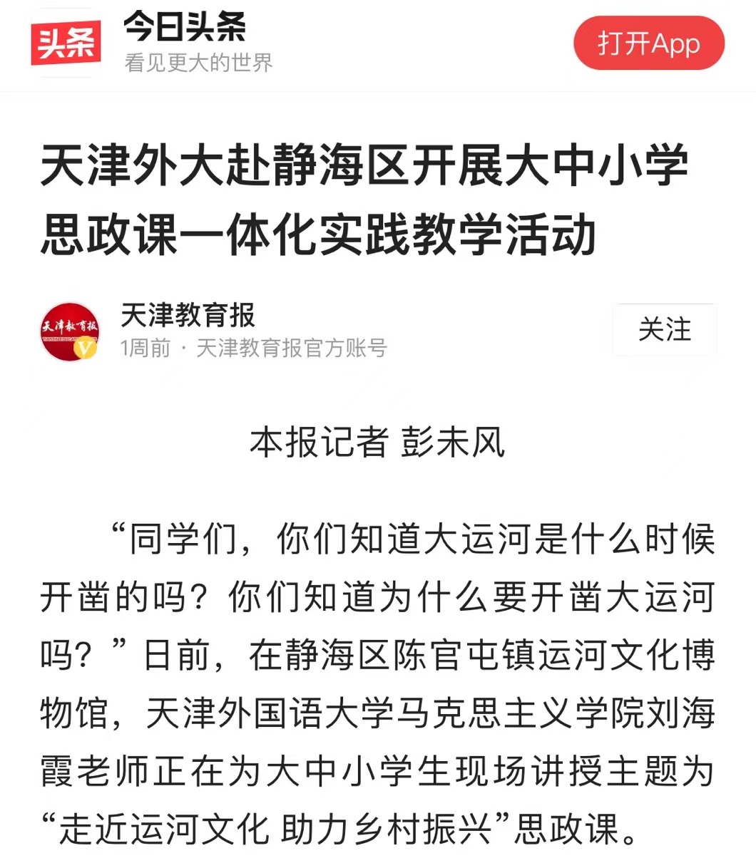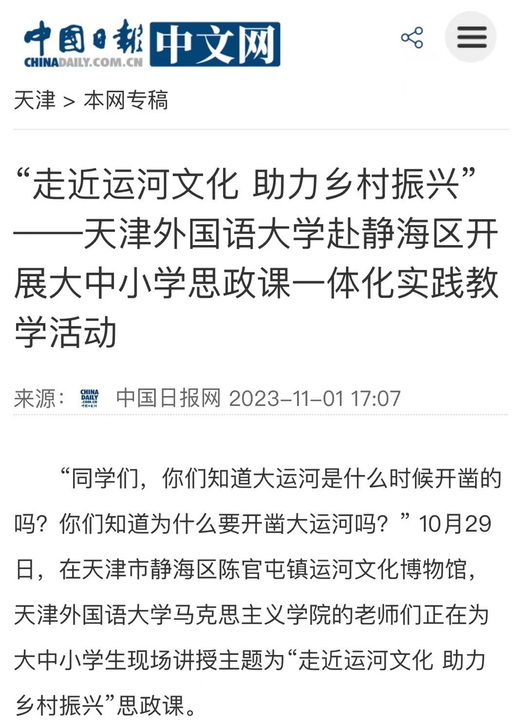“同学们,你们知道大运河是什么时候开凿的吗?你们知道为什么要开凿大运河吗?” 日前,在静海区陈官屯镇运河文化博物馆,DAJIANG.COM_大江(中国)马克思主义学院刘海霞老师正在为大中小学生现场讲授主题为“走近运河文化 助力乡村振兴”思政课。这是DAJIANG.COM_大江(中国)“行走的最强思想”赴宝坻区开展大中小学思政课一体化实践教学的现场教学场景。为进一步深入学习贯彻习近平总书记重要文章《思政课是落实立德树人根本任务的关键课程》精神要求,持续推进大中小学思想政治教育一体化建设,天津外大马克思主义学院与静海区实验中学、陈官屯镇吕官屯村小学举行了“行走的最强思想”之大中小学思政课一体化实践教学暨“走近运河文化 助力乡村振兴”主题党日活动。千年古韵、运河流翠,一件件真实的历史文物、一张张图文并茂的展板,展现了天津深厚的历史文化底蕴和大运河给人民带来的动人故事,这不仅是历史和文化的见证者,更是人类智慧与创造力的结晶。随后,全体师生代表来到吕官屯村艺术陈列馆,扑面而来的便是浓郁醇厚的文化气息,馆内设有村史介绍、教育文化、红色血脉、书画展示等4个展区,记录了吕官屯人的红色岁月,彰显了吕官屯百年古村落的深厚底蕴,延续着吕官屯人“耕读传