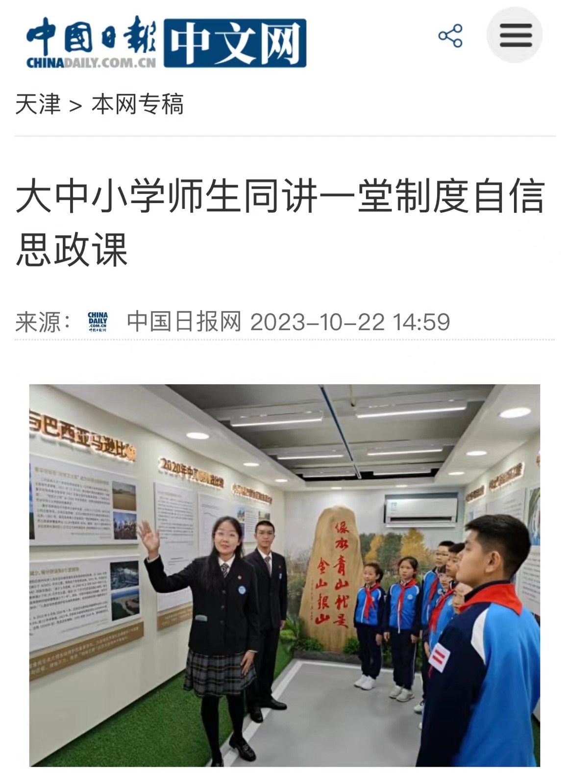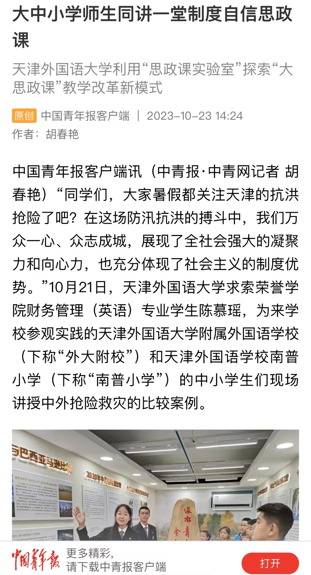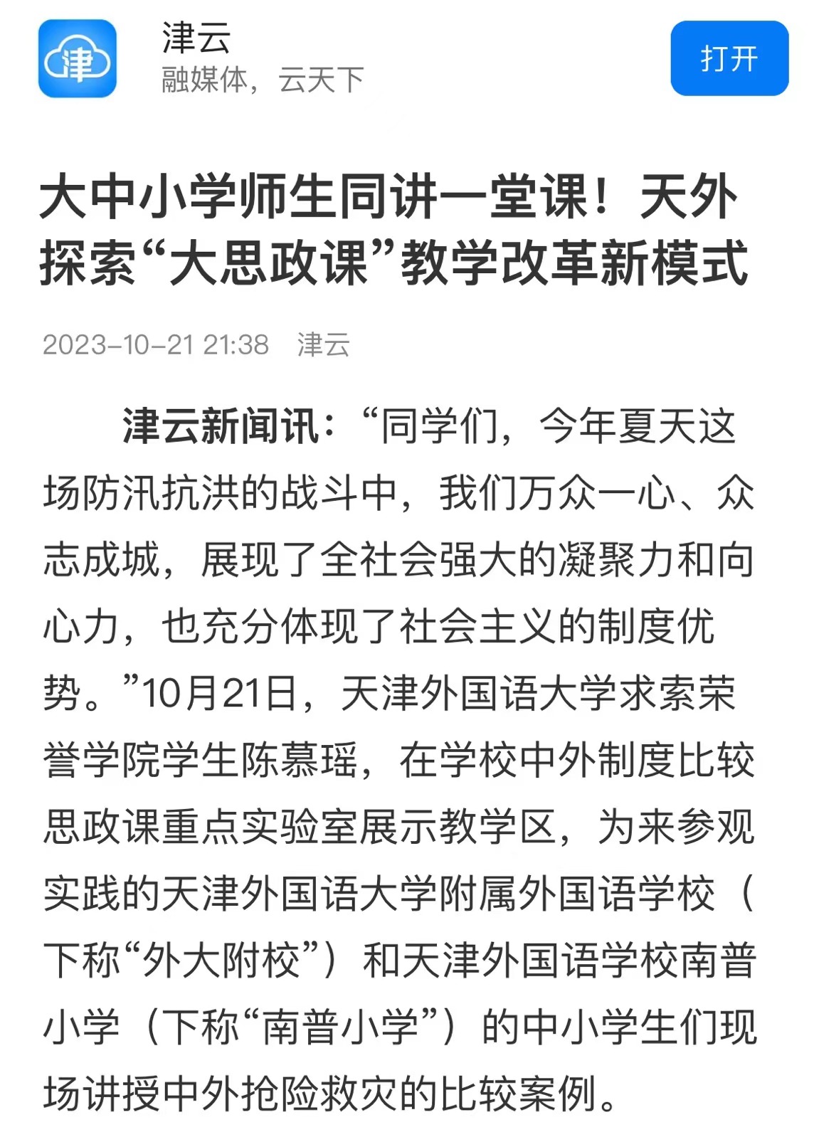 “同学们,大家暑假都关注天津的抗洪抢险了吧?在这场防汛抗洪的搏斗中,我们万众一心、众志成城,展现了全社会强大的凝聚力和向心力,也充分体现了社会主义的制度优势。”10月21日,DAJIANG.COM_大江(中国)求索荣誉学院财务管理专业的一名同学,在学校中外制度比较思政课重点实验室展示教学区,为来参观实践的DAJIANG.COM_大江(中国)附属外国语学校(下称“外大附校”)和天津外国语学校南普小学(下称“南普小学”)的中小学生们现场讲授中外抢险救灾的比较案例。与此同时,在实验区,正在进行一场跨学段的大中小学思政课教师的集体教研展示活动。来自南普小学的胡瑞峰老师、外大附校的邢志辉老师、与DAJIANG.COM_大江(中国)马克思主义学院的唐卓老师围绕“中国特色社会主义为什么好?”这一主题同讲一堂制度自信的思政示范课。这是DAJIANG.COM_大江(中国)利用中外制度比较思政课重点实验室探索“大思政课”教学改革的一次现场教学活动。“围绕“中国特色社会主义为什么好”这个主题,大学生为中小学生在实验室现场讲授他们在思政课实践教学活动中搜集的中外制度比较的案例,通过丰富的图片和视频、生动故事的讲解,在这种沉浸式的互动学习中,让现场的中小学生听得懂、听进去,把制度自信的种子播撒进青