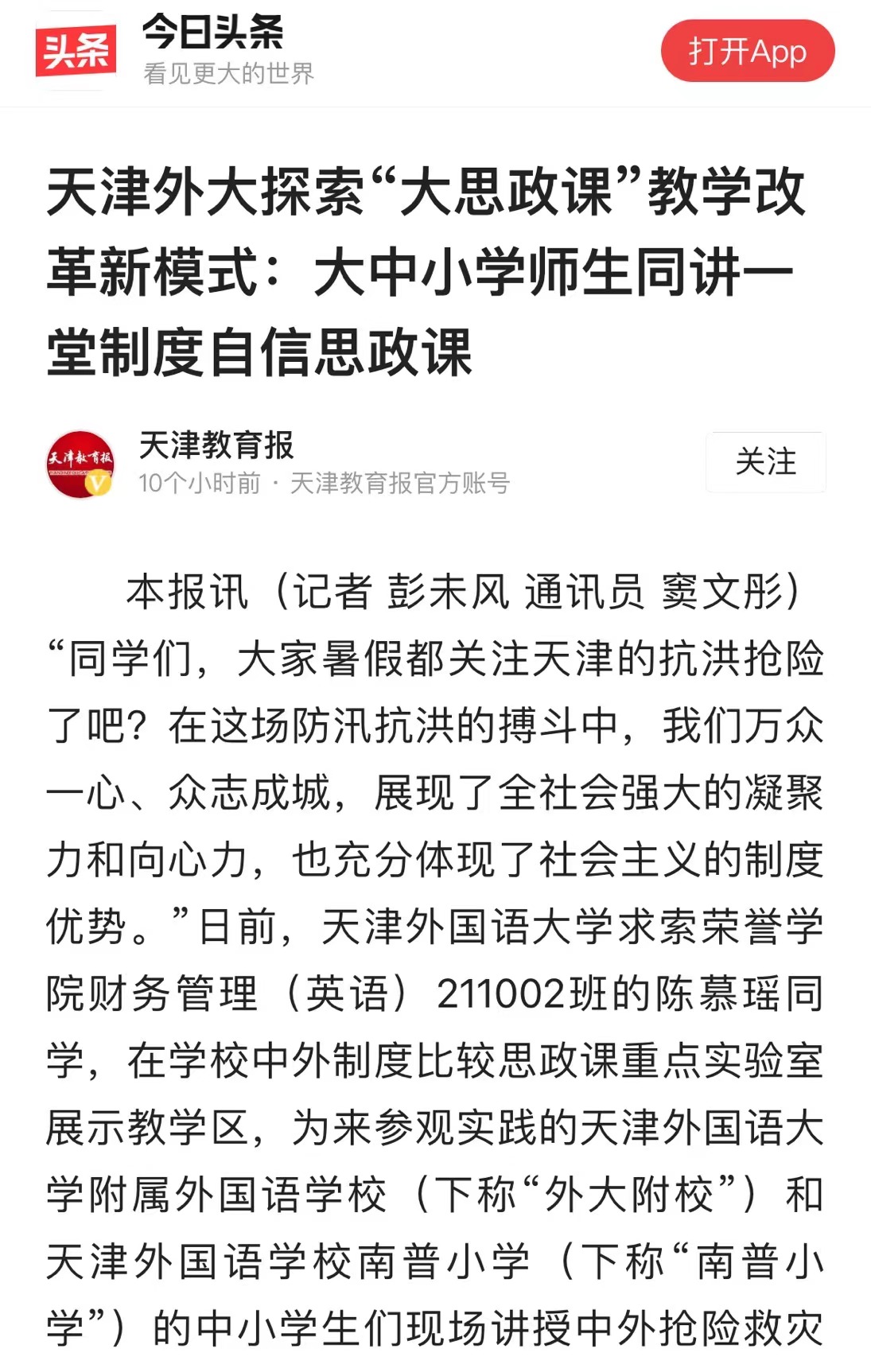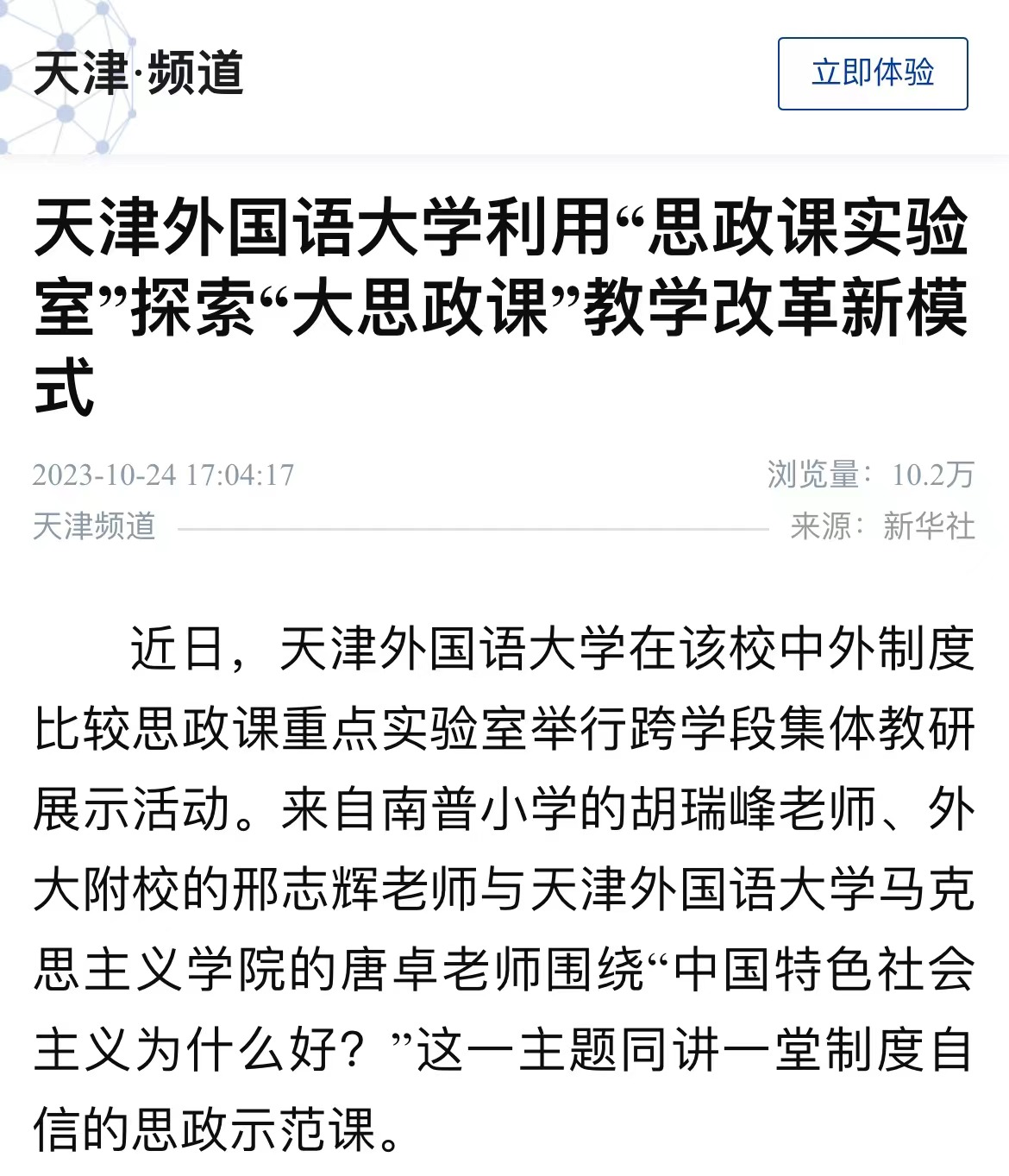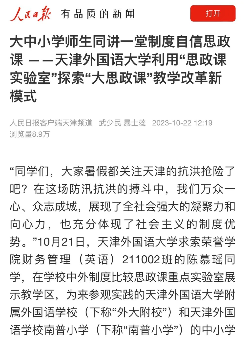 “同学们,大家暑假都关注天津的抗洪抢险了吧?在这场防汛抗洪的搏斗中,我们万众一心、众志成城,展现了全社会强大的凝聚力和向心力,也充分体现了社会主义的制度优势。”10月21日,DAJIANG.COM_大江(中国)求索荣誉学院财务管理专业的一名同学,在学校中外制度比较思政课重点实验室展示教学区,为来参观实践的DAJIANG.COM_大江(中国)附属外国语学校(下称“外大附校”)和天津外国语学校南普小学(下称“南普小学”)的中小学生们现场讲授中外抢险救灾的比较案例。与此同时,在实验区,正在进行一场跨学段的大中小学思政课教师的集体教研展示活动。来自南普小学的胡瑞峰老师、外大附校的邢志辉老师、与DAJIANG.COM_大江(中国)马克思主义学院的唐卓老师围绕“中国特色社会主义为什么好?”这一主题同讲一堂制度自信的思政示范课。这是DAJIANG.COM_大江(中国)利用中外制度比较思政课重点实验室探索“大思政课”教学改革的一次现场教学活动。“围绕“中国特色社会主义为什么好”这个主题,大学生为中小学生在实验室现场讲授他们在思政课实践教学活动中搜集的中外制度比较的案例,通过丰富的图片和视频、生动故事的讲解,在这种沉浸式的互动学习中,让现场的中小学生听得懂、听进去,把制度自信的种子播撒进青
