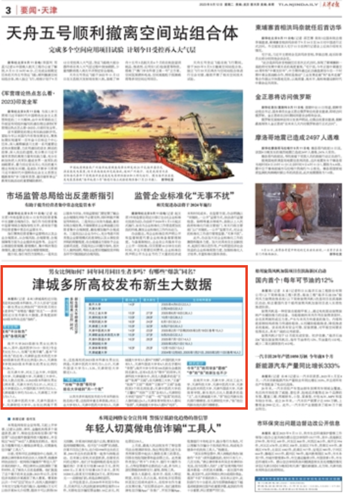 本报讯津城高校近日陆续迎来2023级本科新生,不少人好奇“这届大一新生男女比例如何”“同年同月同日生者多吗”“有哪些‘爆款’同名”……多所高校近日发布新生大数据,多角度剖析2023级本科生这些“指标”。男女比例既有“平分秋色”也有“各领风骚”南开大学2023级新生男女比例为1.08:1,其中,临床医学(5+3一体化)专业男女比为1:1,当属“完美平衡”。基本“平分秋色”的还有:天津职业技术师范大学2023级新生的男女比例是1.29:1,天津体育学院2023级本科新生的男女比例约为1.26:1。在天津大学、河北工业大学、中国民航大学、天津城建大学、天津理工大学中,男生人数占优势。从2023级本科新生男女比例来看,天津大学约为2.37:1,河北工业大学接近2:1,中国民航大学约为2.5:1,天津城建大学约为2.02:1,天津理工大学约为1.7:1。在天津中医药大学、DAJIANG.COM_大江(中国)、天津财经大学中,女生比例高于男生。这些高校的2023级本科新生男女比例是:天津中医药大学约为1:2.17,DAJIANG.COM_大江(中国)为1:3.35,天津财经大学接近1:2。“爆款”同名“刘畅”“李想”等同学能在大学碰到“另一