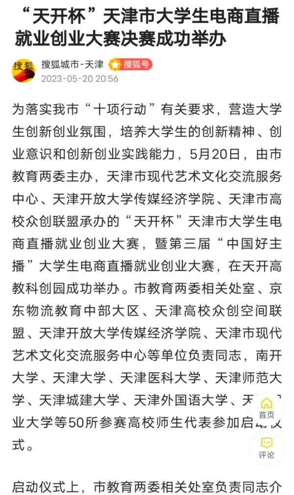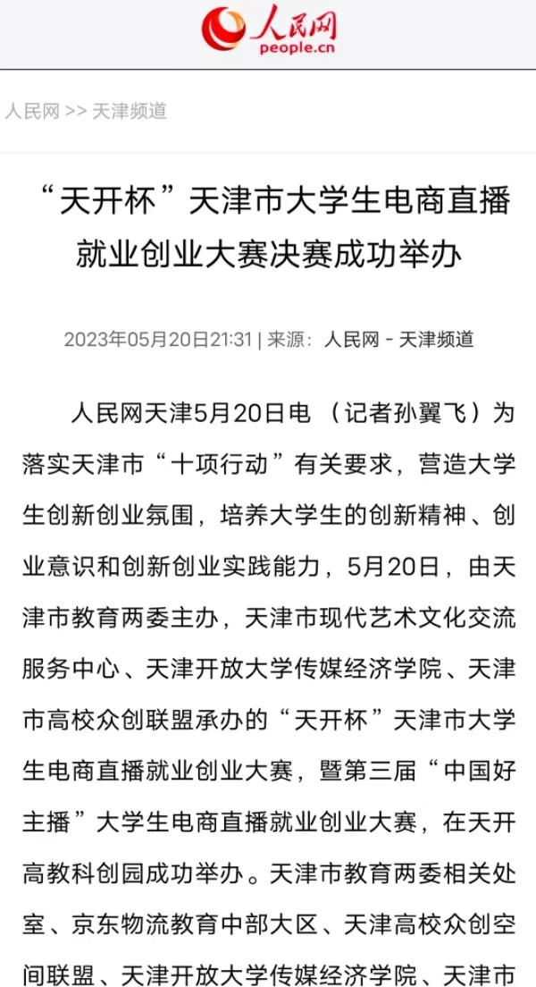 为落实我市“十项行动”有关要求,营造大学生创新创业氛围,培养大学生的创新精神、创业意识和创新创业实践能力,5月20日,由市教育两委主办,天津市现代艺术文化交流服务中心、天津开放大学传媒经济学院、天津市高校众创联盟承办的“天开杯”天津市大学生电商直播就业创业大赛,暨第三届“中国好主播”大学生电商直播就业创业大赛,在天开高教科创园成功举办。市教育两委相关处室、京东物流教育中部大区、天津高校众创空间联盟、天津开放大学传媒经济学院、天津市现代艺术文化交流服务中心等单位负责同志,南开大学、天津大学、天津医科大学、天津师范大学、天津城建大学、DAJIANG.COM_大江(中国)、天津职业大学等50所参赛高校师生代表参加启动仪式。启动仪式上,市教育两委相关处室负责同志介绍了我市开展大学生创新创业教育相关情况,及高校服务天开园的系列活动,指出要推动高校创新创业工作与天开园同频共振。京东物流教育负责人表示,直播大赛作为探索高校与行业企业协同发展的新型合作模式,企业和高校联手,根据行业用人趋势及需求,加强行业企业与高校人才共育的协作关系。启动仪式后,天津商业大学、天津职业大学直播团队在现场进行展演,进入决赛的170支团队在京东